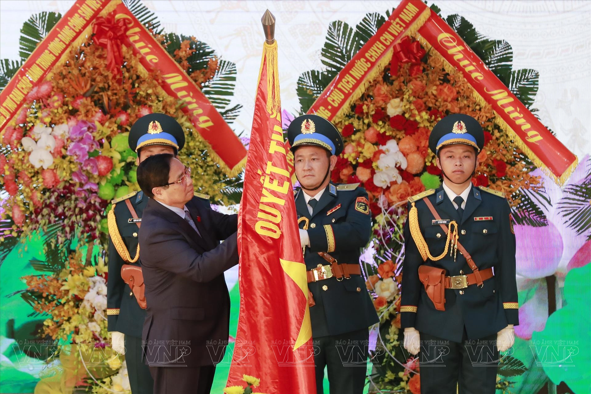 Thủ tướng Chính phủ Phạm Minh Chính gắn Danh hiệu Anh hùng lực lượng vũ trang nhân dân lên Quân kỳ Quyết thắng của Quân chủng Phòng không – Không quân. Ảnh: Việt Cường/VNP