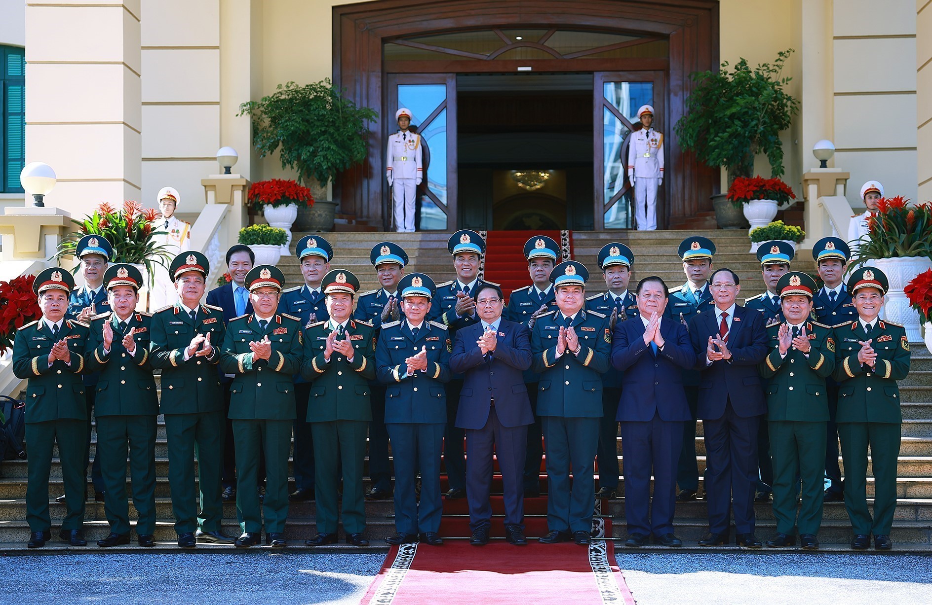 Thủ tướng Chính phủ Phạm Minh Chính với lãnh đạo Bộ Quốc phòng và Quân chủng Phòng không - Không quân. Ảnh: Dương Giang/TTXVN