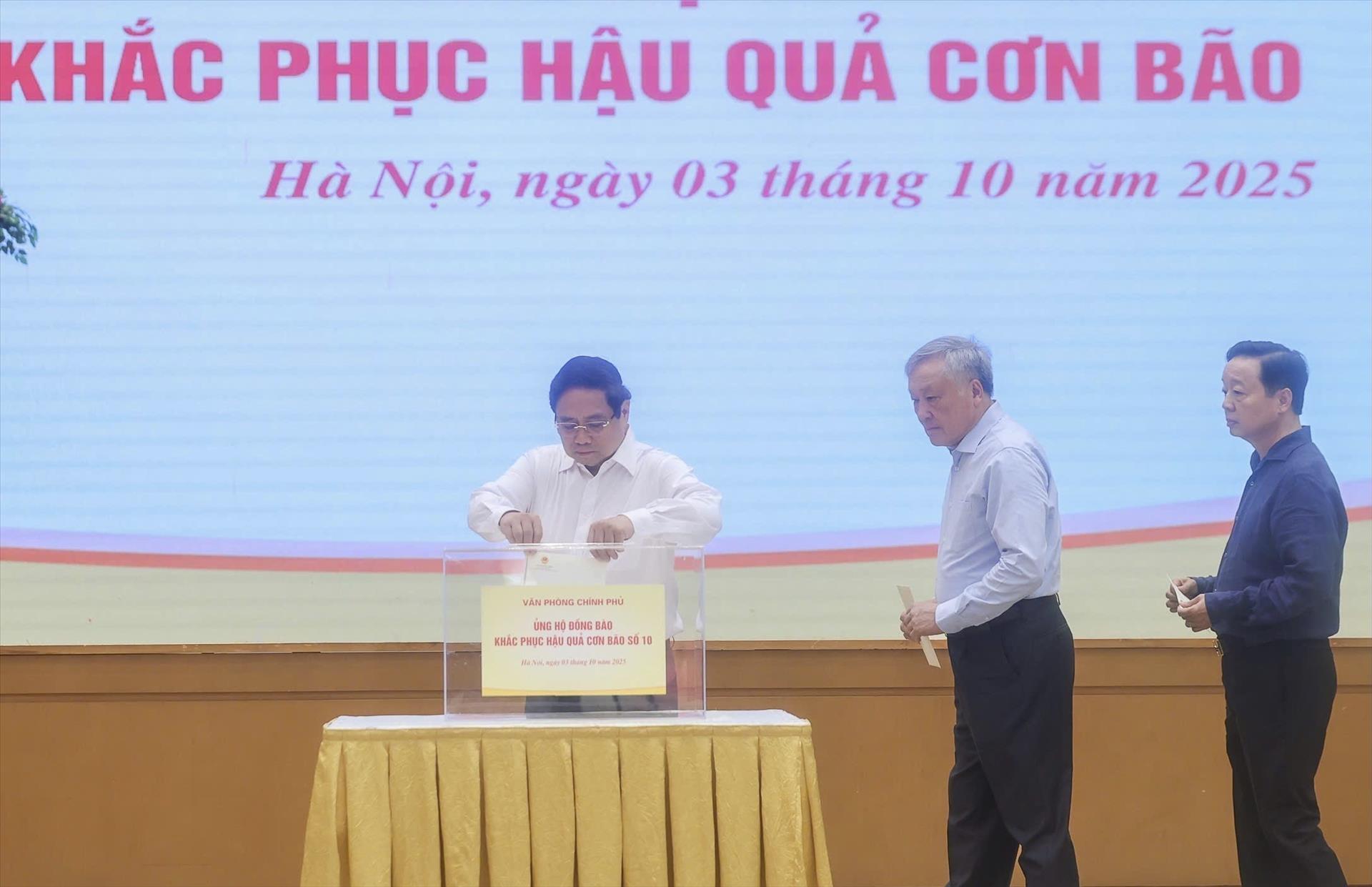 Thủ tướng Chính phủ Phạm Minh Chính và các Phó Thủ tướng quyên góp, ủng hộ đồng bào khắc phục hậu quả bão số 10. Ảnh: Dương Giang - TTXVN