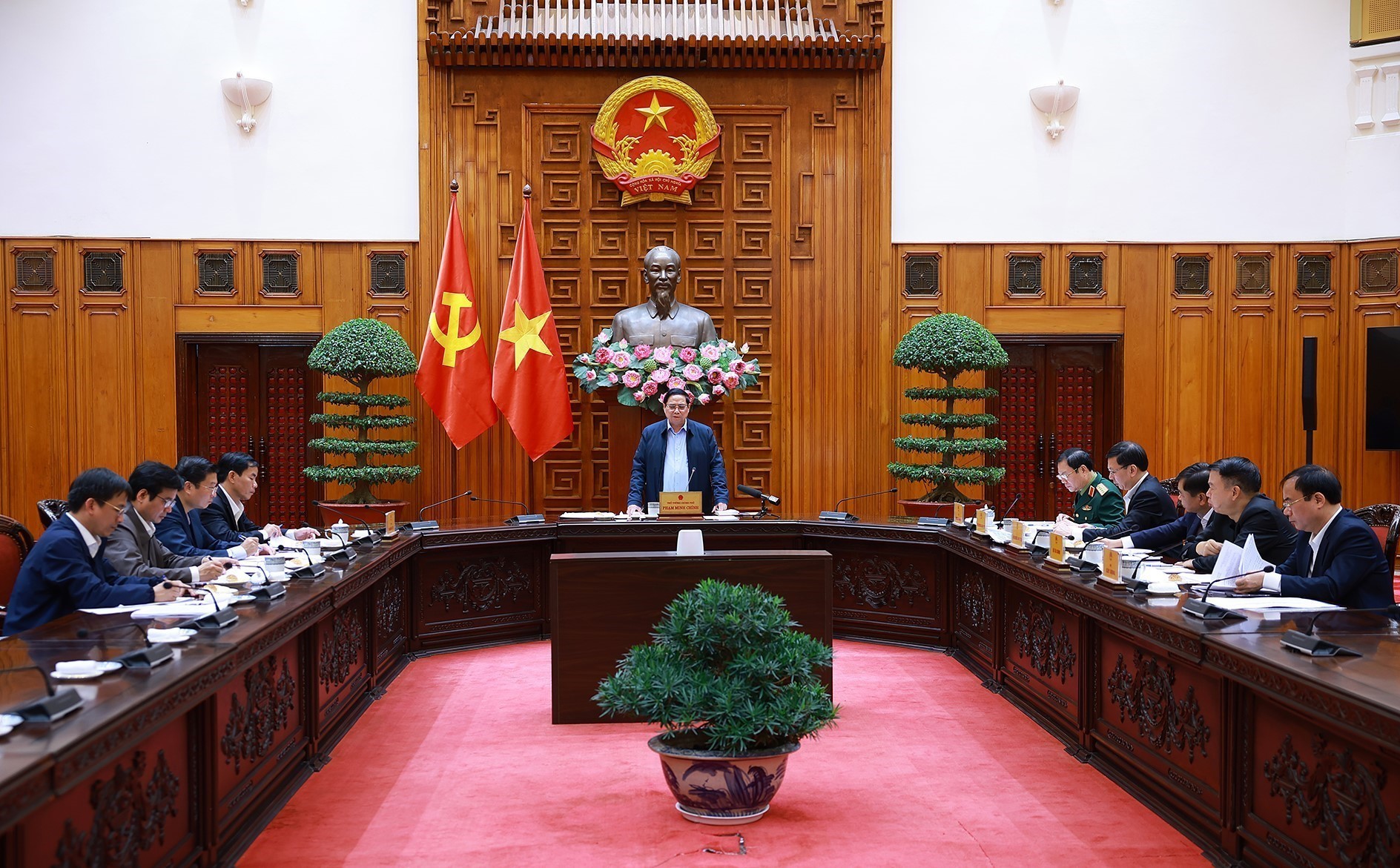 Thủ tướng Phạm Minh Chính chủ trì cuộc họp với lãnh đạo tỉnh Quảng Trị về xây dựng nhà ở cho các gia đình bị thiệt hại do thiên tai tại Quảng Trị. Ảnh: Dương Giang-TTXVN