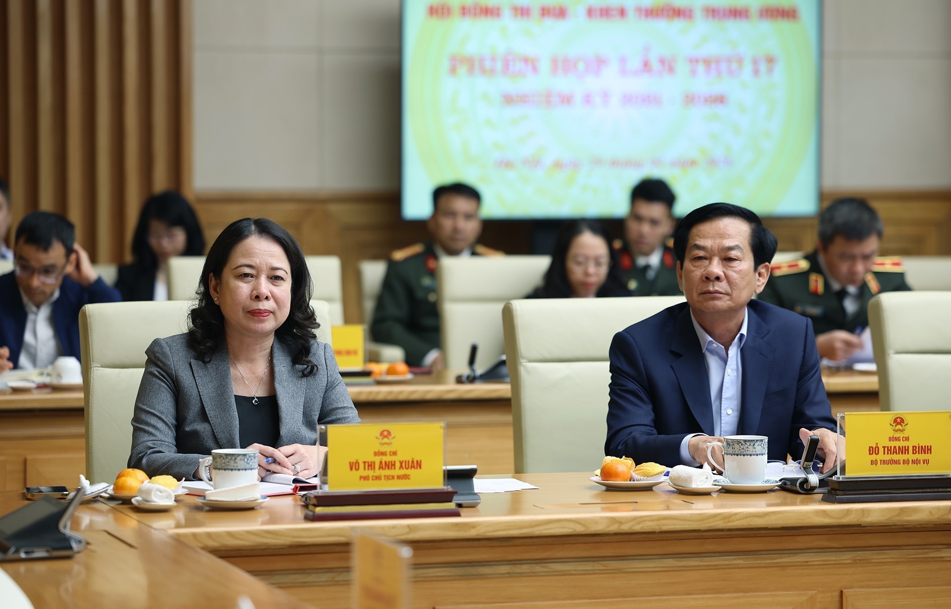 Phó Chủ tịch nước Võ Thị Ánh Xuân, Phó Chủ tịch thứ nhất và Bộ trưởng Bộ Nội vụ Đỗ Thanh Bình, Phó Chủ tịch Thường trực Hội đồng Thi đua-Khen thưởng Trung ương tham dự phiên họp. Ảnh: Dương Giang-TTXVN