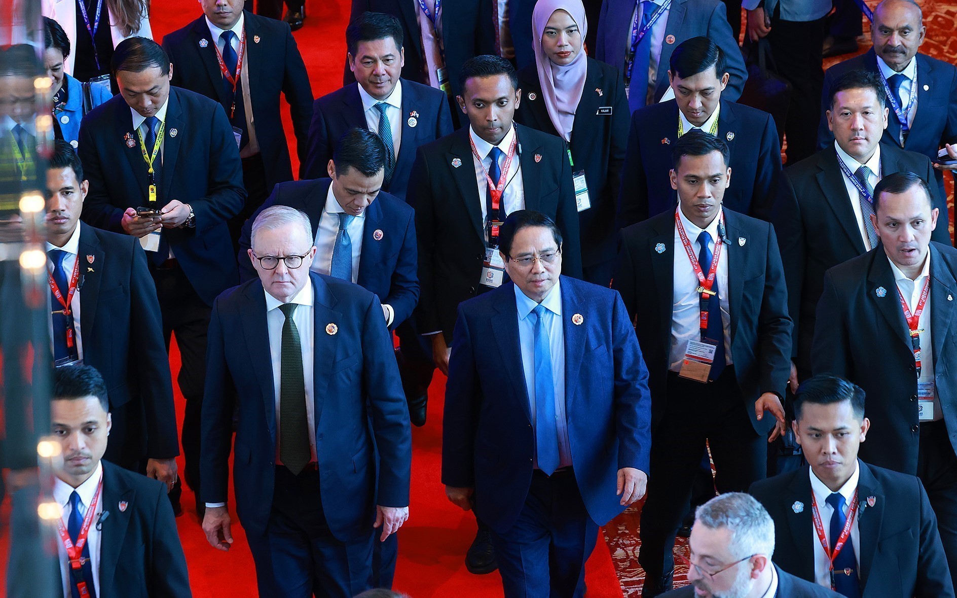 Thủ tướng Phạm Minh Chính và Thủ tướng Australia Anthony Albanese đến dự Hội nghị Cấp cao Đông Á (EAS) lần thứ 20. Ảnh: Dương Giang - TTXVN