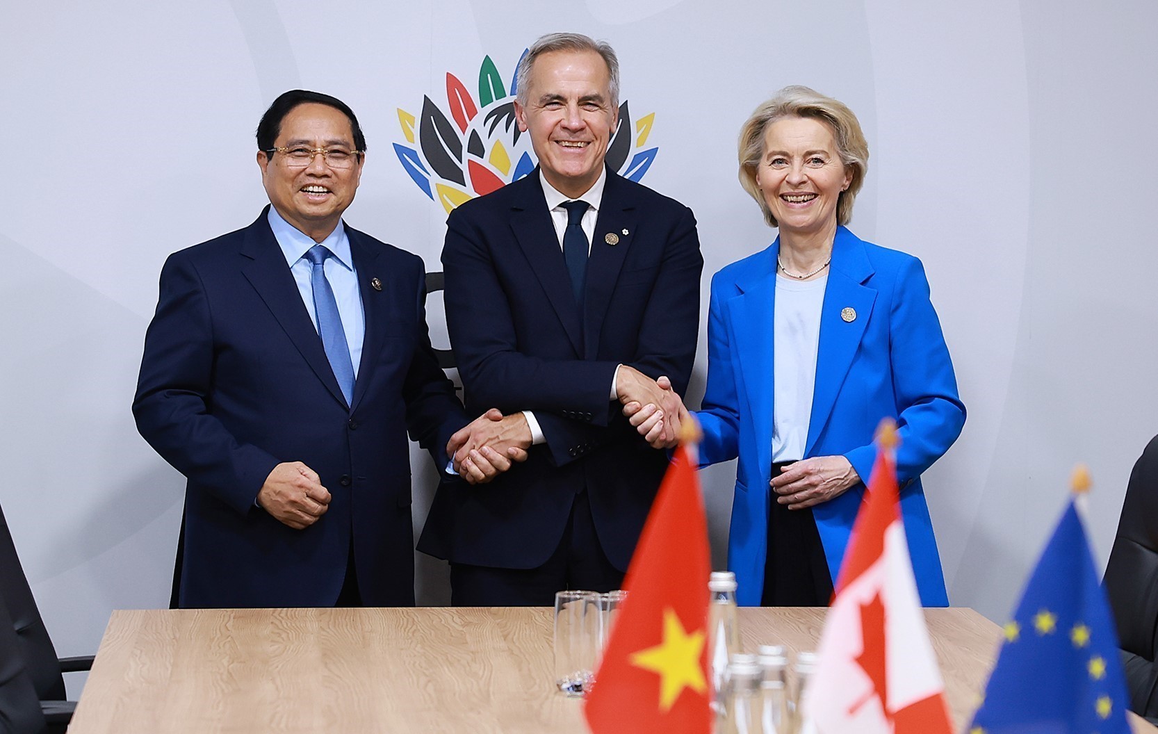 * Gặp lại Thủ tướng Canada Mark Carney, Thủ tướng Phạm Minh Chính đánh giá cao những tiến triển tích cực trong quan hệ hai nước thời gian qua trên tất cả các lĩnh vực, tạo tiền đề thuận lợi để đẩy mạnh hợp tác thực chất, hiệu quả hơn thời gian tới. Thủ tướng bày tỏ mong muốn đưa hợp tác kinh tế, thương mại, đầu tư, khoa học công nghệ trở thành trụ cột quan trọng trong quan hệ song phương, nhằm khai thác hiệu quả tính bổ trợ giữa hai nền kinh tế và lợi thế cùng là thành viên của Hiệp định Đối tác toàn diện và tiến bộ xuyên Thái Bình Dương (CPTPP); đề nghị Canada mở cửa thị trường cho hàng hóa Việt Nam, đẩy mạnh đầu tư và kết nối chuỗi cung ứng theo hướng bền vững, cùng có lợi.
