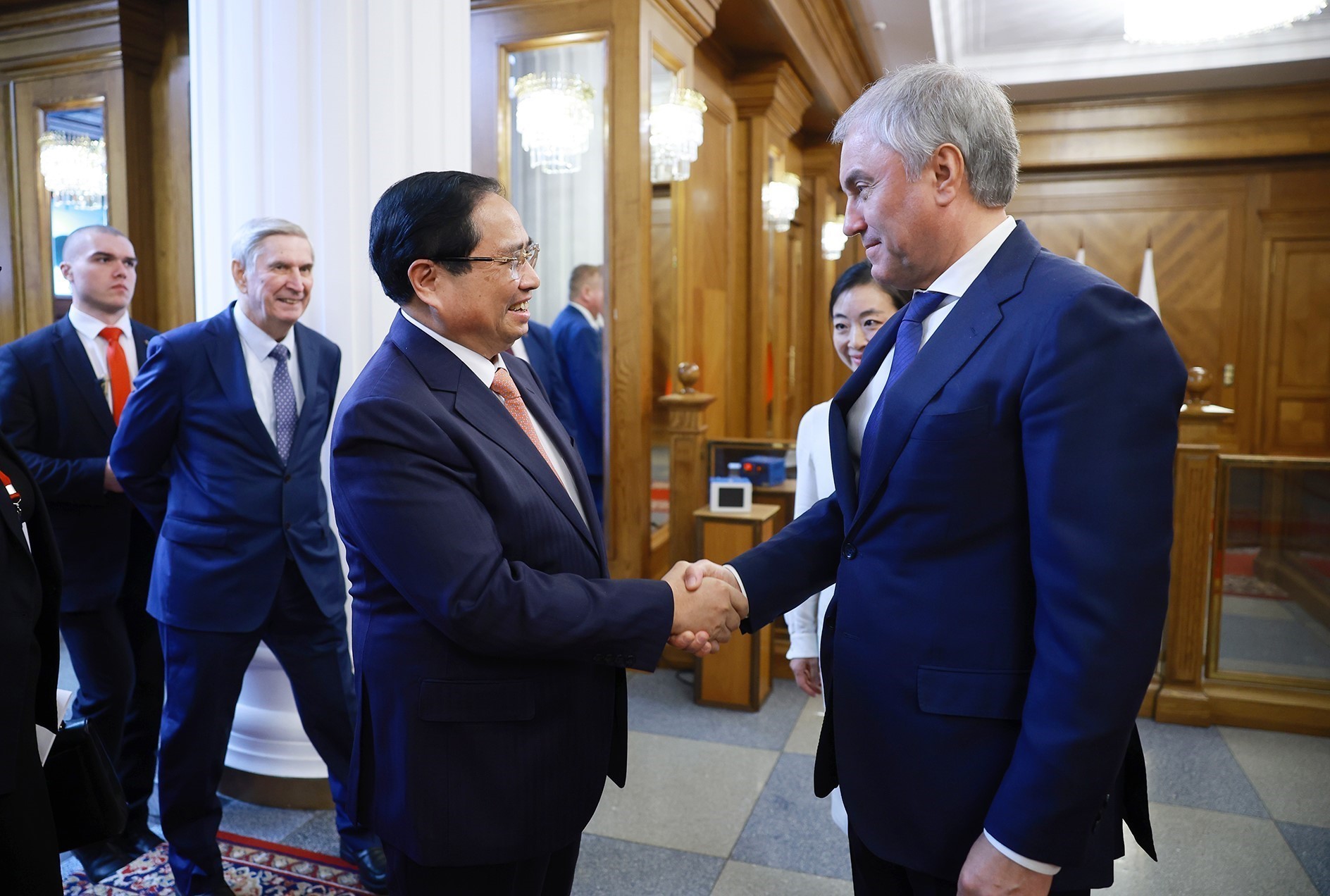 Thủ tướng Chính phủ Phạm Minh Chính đánh giá cao vai trò của Đuma Quốc gia Nga và Chủ tịch Vyacheslav Volodin trong việc hoàn thiện khuôn khổ pháp lý, tạo thuận lợi triển khai các thỏa thuận cấp cao, hỗ trợ thực hiện các chương trình, kế hoạch, dự án hợp tác cụ thể, nhằm thúc đẩy và làm sâu sắc hợp tác Việt Nam–Nga, cảm ơn sự quan tâm tạo điều kiện và bảo đảm an ninh của Quốc hội Nga cho cộng đồng người Việt Nam sinh sống, làm ăn và học tập ổn định, hòa nhập vào sở tại, góp phần là cầu nối hữu nghị và hợp tác giữa hai nước, hai dân tộc. Thủ tướng Chính phủ Phạm Minh Chính cũng chúc phía Nga sẽ tổ chức thành công cuộc bầu cử Đuma Quốc gia vào tháng 9/2026.