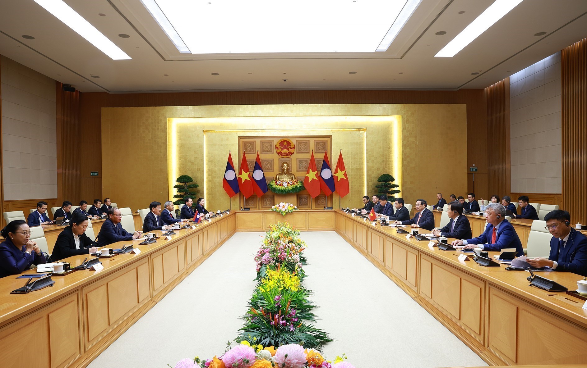 Trao đổi về hợp tác song phương, Thủ tướng Chính phủ Phạm Minh Chính bày tỏ vui mừng nhận thấy quan hệ hữu nghị vĩ đại, đoàn kết đặc biệt và hợp tác toàn diện Việt Nam - Lào tiếp tục phát triển tốt đẹp trong thời gian qua. Lãnh đạo cấp cao hai nước thường xuyên gặp gỡ, trao đổi tại các cuộc làm việc song phương cũng như tại các diễn đàn khu vực và quốc tế, cùng nhau trao đổi nhiều nội dung sâu rộng, toàn diện và thực chất về các vấn đề cốt lõi làm sâu sắc hơn quan hệ gắn bó giữa hai Đảng, hai nước.