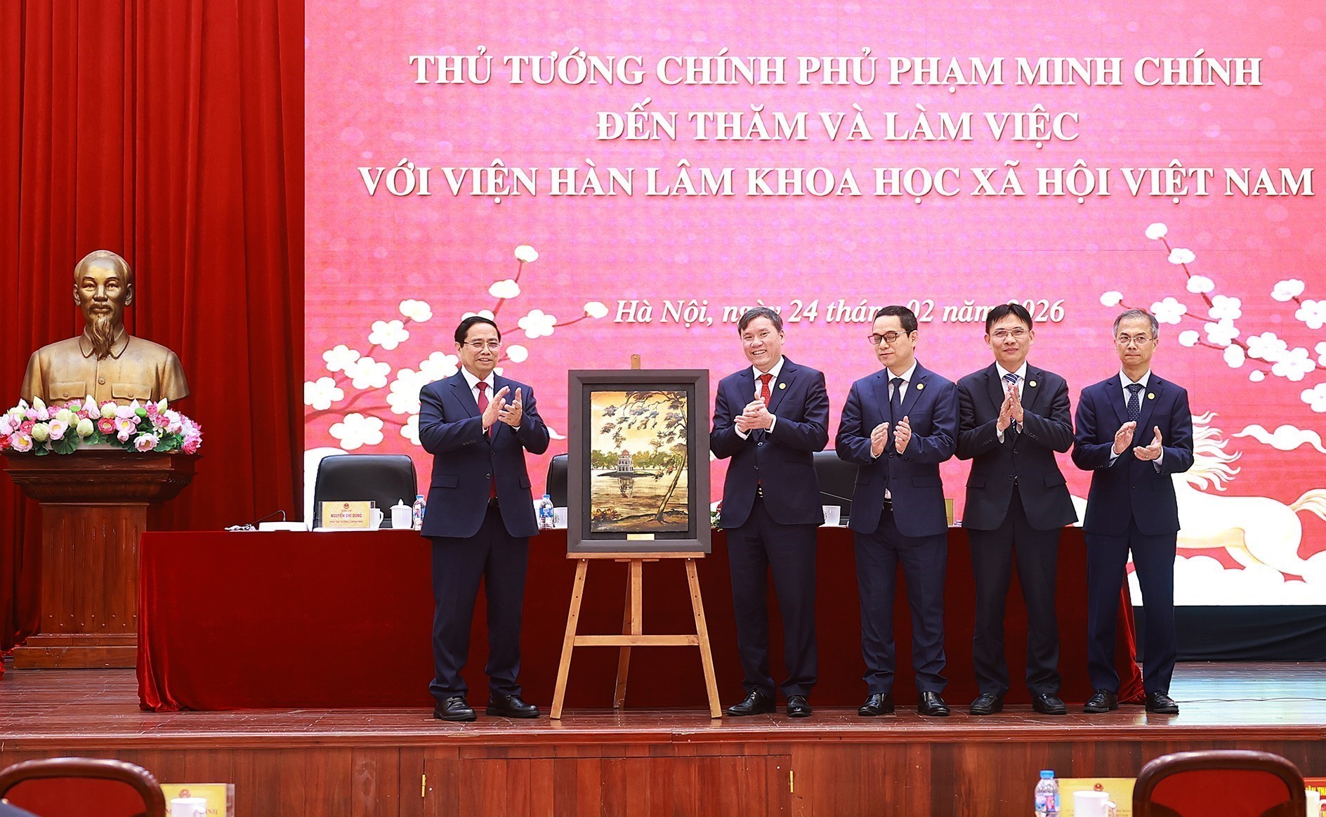 Trên cơ sở đó, Thủ tướng nhấn mạnh, thời gian tới, Viện Hàn lâm Khoa học xã hội Việt Nam cần phát triển đột phá, khẳng định vai trò “cơ quan tham mưu chiến lược” của Đảng, Nhà nước về khoa học xã hội và nhân văn với phương châm 24 chữ: “Lý luận phát triển - Bản sắc giữ gìn - Truyền thống phát huy - Tinh hoa hấp thụ - Phản biện sắc sảo - Kiến tạo tương lai”. Viện phải tập trung cao độ triển khai quyết liệt, hiệu quả Nghị quyết Đại hội XIV của Đảng và các nghị quyết chuyên đề của Bộ Chính trị với quyết tâm cao, nỗ lực lớn, hành động quyết liệt, hiệu quả, phân công “6 rõ” và bảo đảm nguồn lực thực thiện; nâng cao chất lượng nghiên cứu cơ bản gắn với bảo vệ nền tảng tư tưởng của Đảng trong kỷ nguyên mới. Viện chủ động, tích cực tham gia nghiên cứu tổng kết 100 năm Đảng lãnh đạo cách mạng Việt Nam, 40 năm thực hiện Cương lĩnh xây dựng và phát triển đất nước thời kỳ quá độ lên chủ nghĩa xã hội ở Việt Nam.