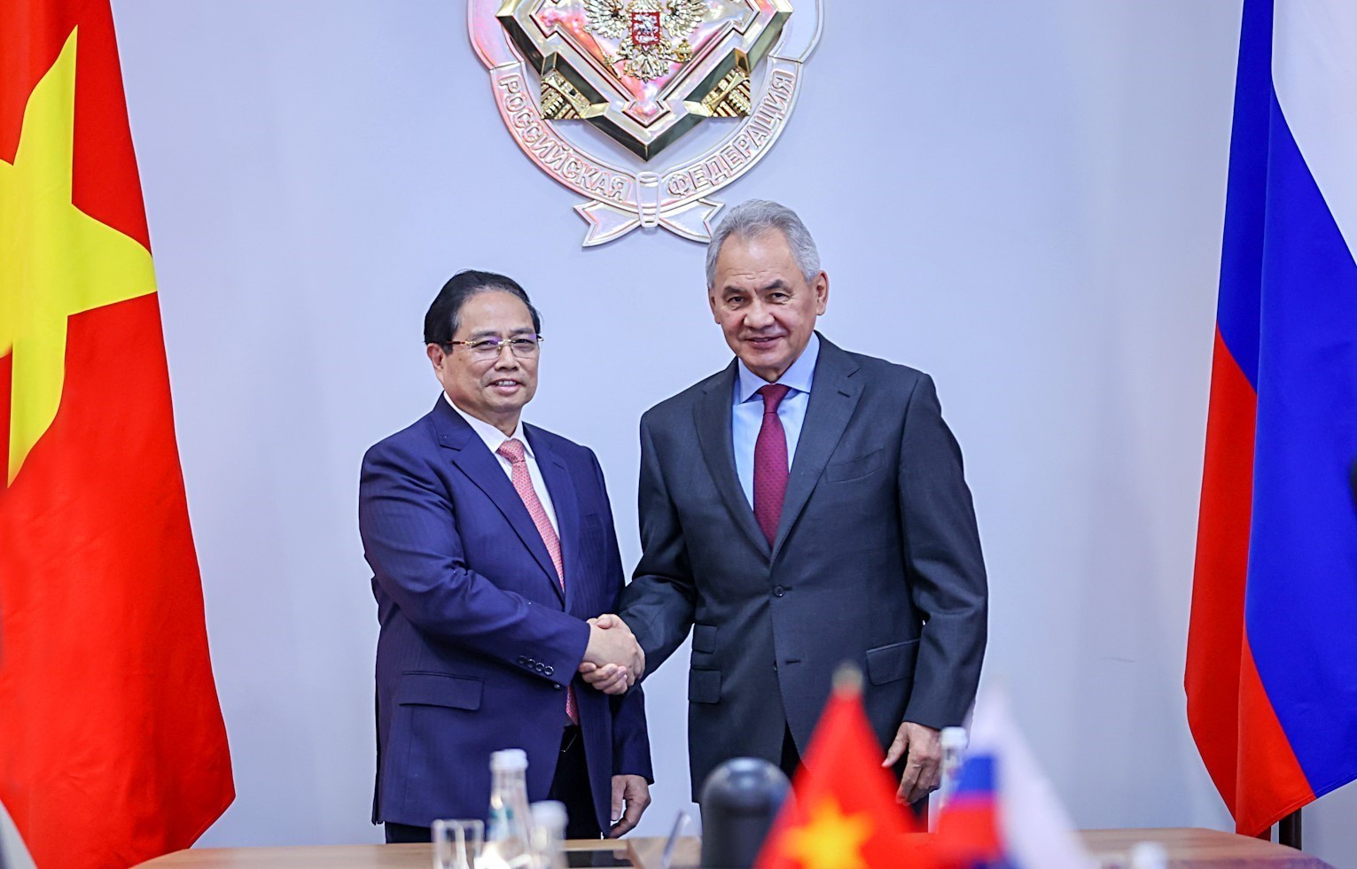 Chào mừng Thủ tướng Chính phủ Phạm Minh Chính tới Liên bang Nga, Thư ký Hội đồng An ninh Liên bang Nga Sergey Shoigu bày tỏ vui mừng được gặp lại Thủ tướng sau chuyến thăm Việt Nam rất thành công vào tháng 12/2025. Thư ký Hội đồng An ninh Nga chúc mừng thành công của Đại hội XIV của Đảng Cộng sản Việt Nam và cuộc bầu cử Quốc hội khóa XVI, và tin tưởng dưới sự lãnh đạo của Đảng Cộng sản Việt Nam, Việt Nam sẽ thực hiện thắng lợi các ưu tiên chiến lược, đưa đất nước phát triển thịnh vượng trong thời gian tới.