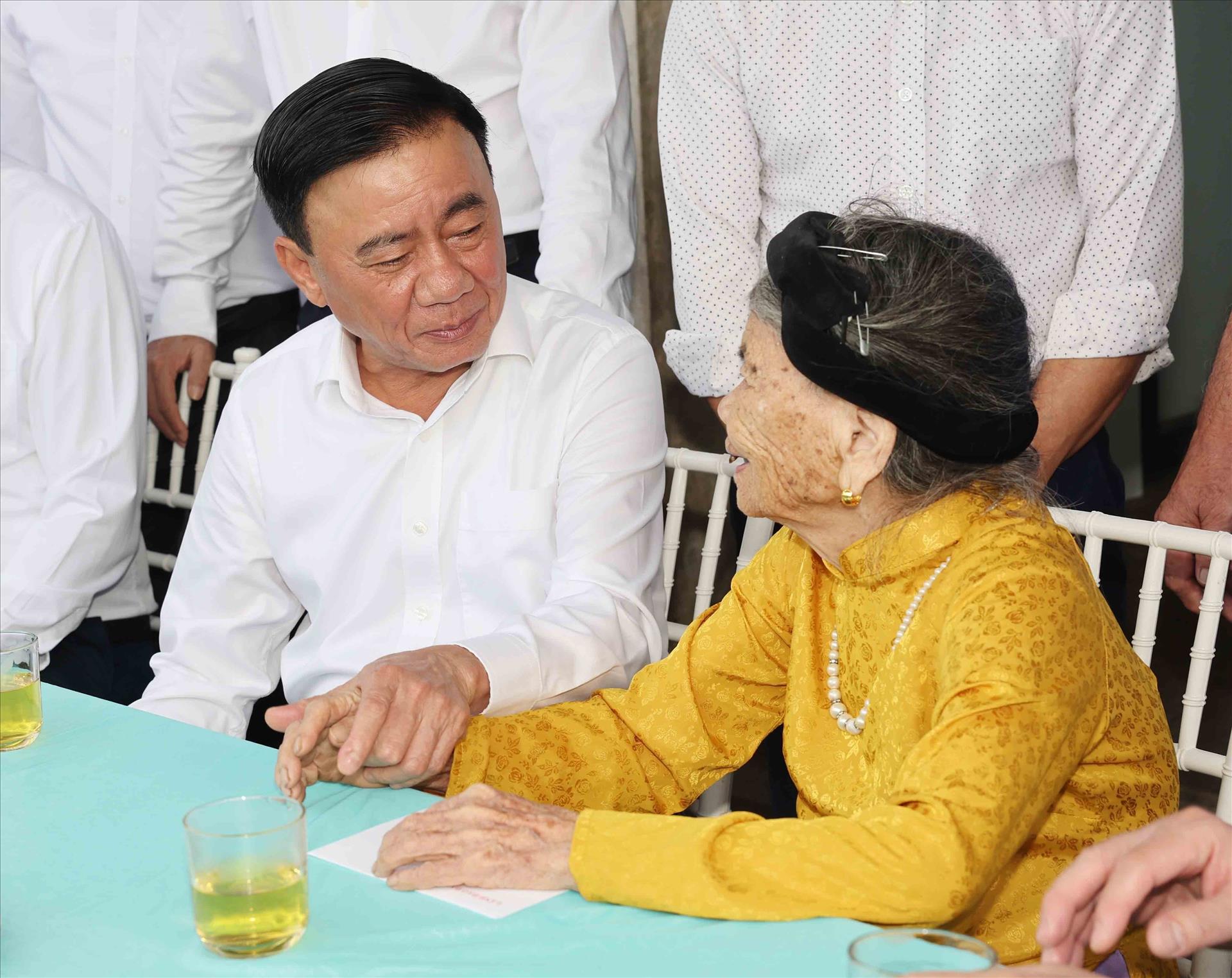 Thường trực Ban Bí thư Trần Cẩm Tú thăm hỏi Mẹ Việt Nam Anh hùng Trần Thị Em, xã Đại Huệ, tỉnh Nghệ An. Ảnh: Phương Hoa - TTXVN