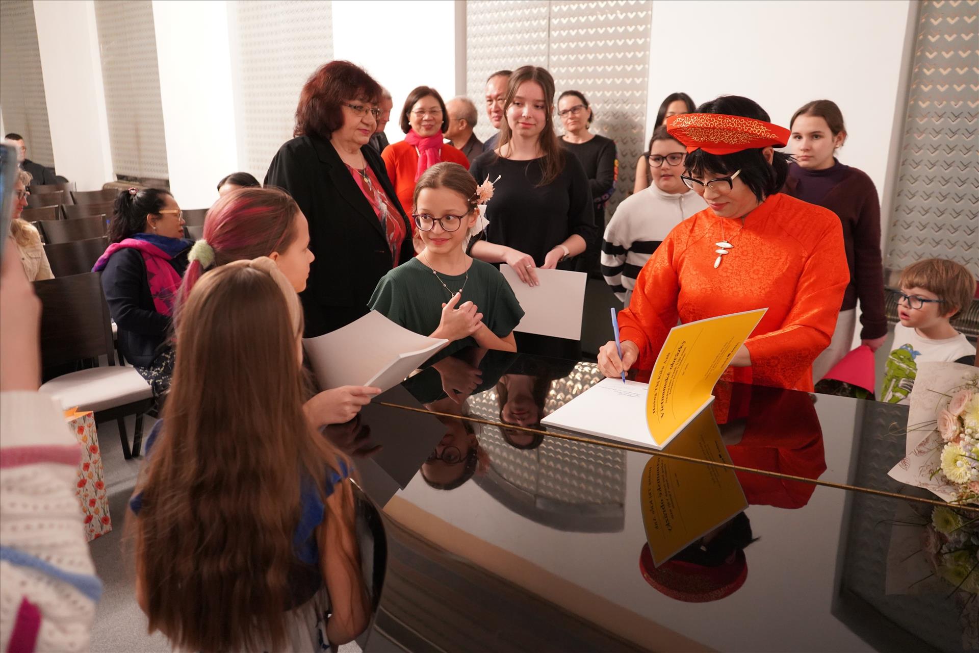 Nghệ sĩ Kiều Anh ký tặng các học sinh và phụ huynh tại buổi hòa nhạc. Ảnh: TTXVN