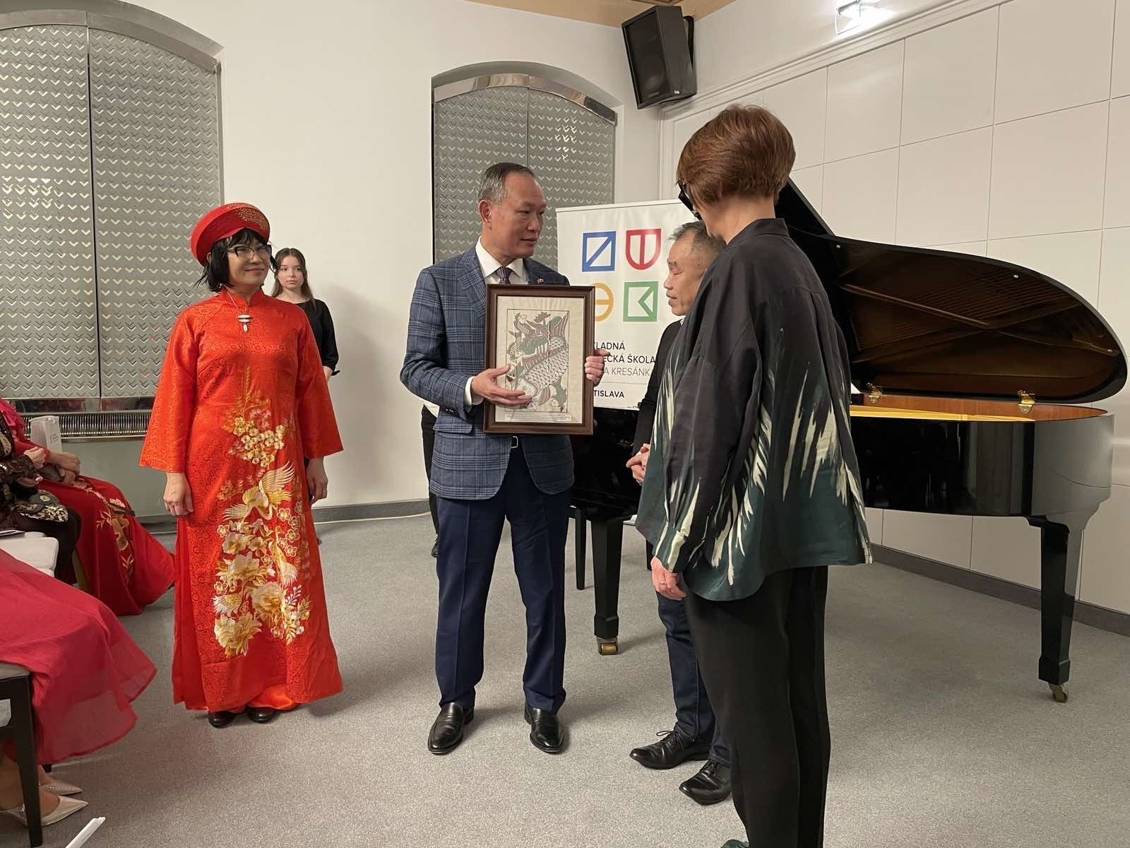 Đại sứ Việt Nam tại Slovakia Phạm Trường Giang tặng quà cho Hiệu trưởng trường nhạc. Ảnh: TTXVN