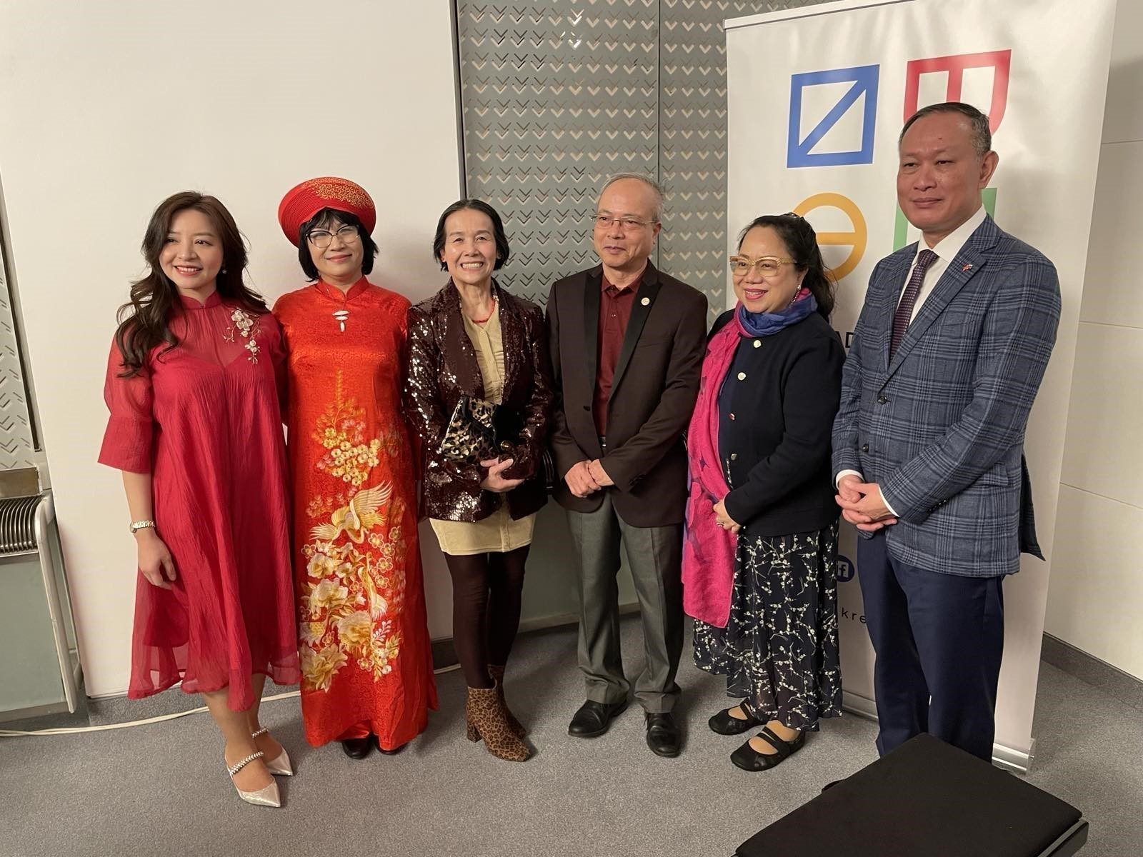 Đại sứ Việt Nam tại Slovakia Phạm Trường Giang, nghệ sĩ Kiều Anh và đại diện kiều bào tại Slovakia. Ảnh: TTXVN