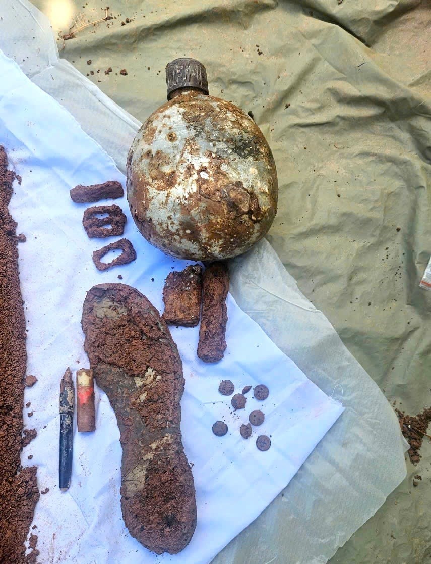 Các hài cốt ở độ sâu 0,8 đến 1m, được bọc trong lớp vải dù, kèm các di vật như: mũ cối, giày, thắt lưng, võng bộ đội, hộp tiếp đạn, đạn AK và các đồ dùng cá nhân… Ảnh: TTXVN phát