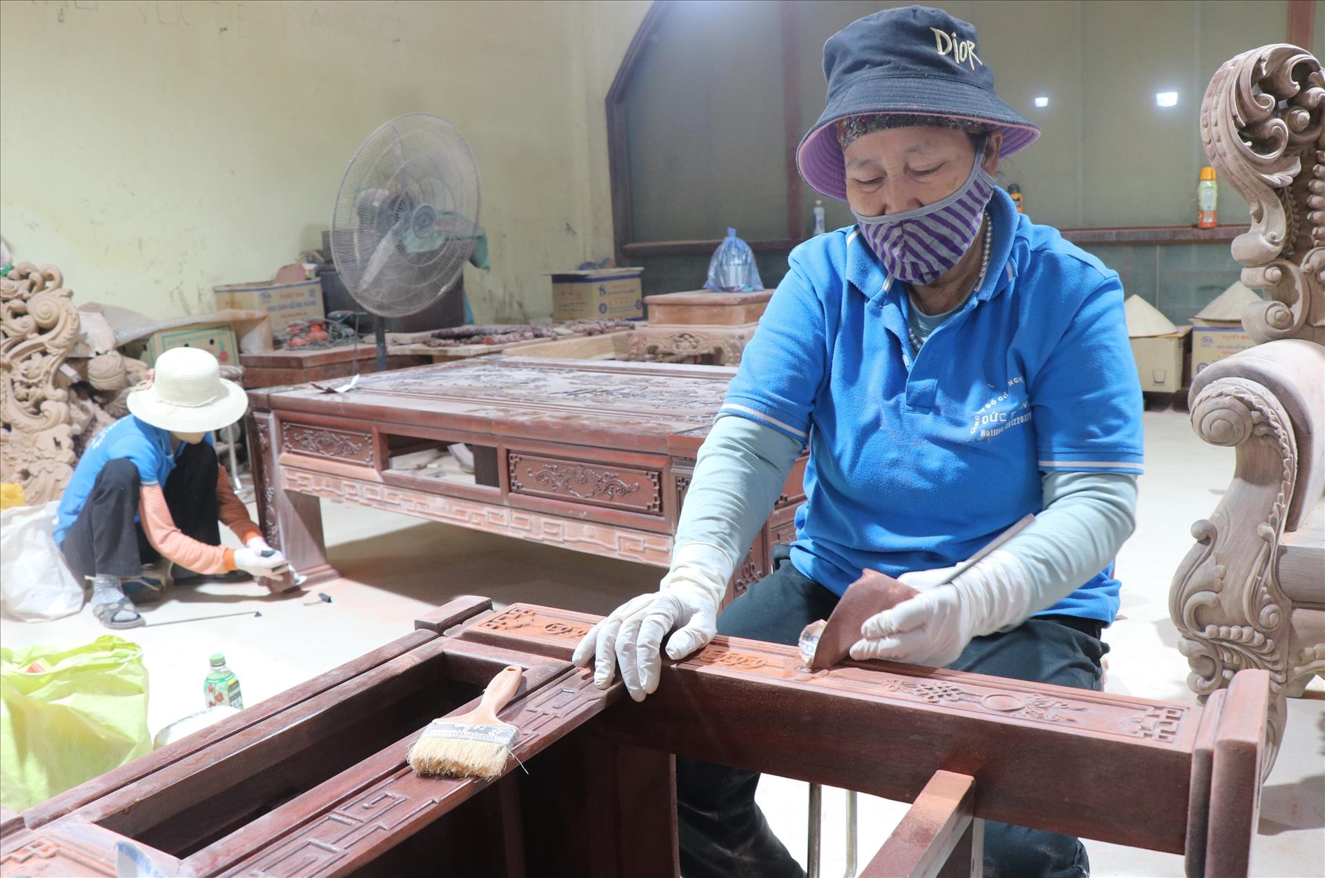 Những người thợ tỷ mỉ, cẩn thận đánh giấy giáp cho gỗ lỳ, bóng. Ảnh: Thanh Thương - TTXVN