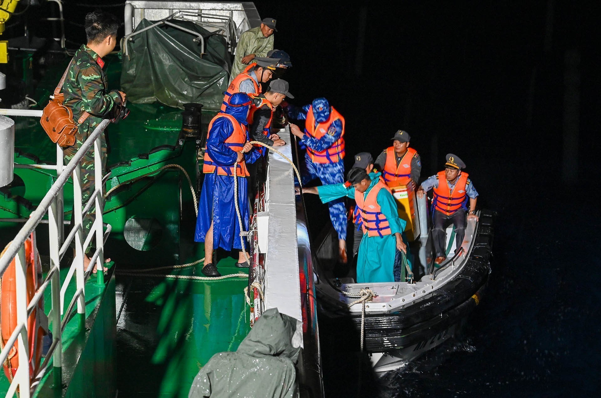 Tổ Bầu cử xuống xuồng cơ động tiếp cận tàu CSB 6008-Bộ Tư lệnh Vùng Cảnh sát biển 3. Ảnh: TTXVN phát