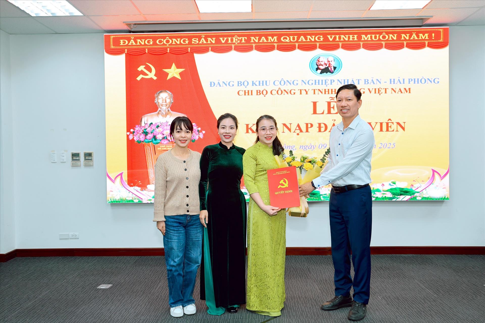 Trao quyết định kết nạp Đảng cho đảng viên mới tại Đảng ủy KCN Nhật Bản – Hải Phòng. Ảnh: Tiến Vĩnh – TTXVN
