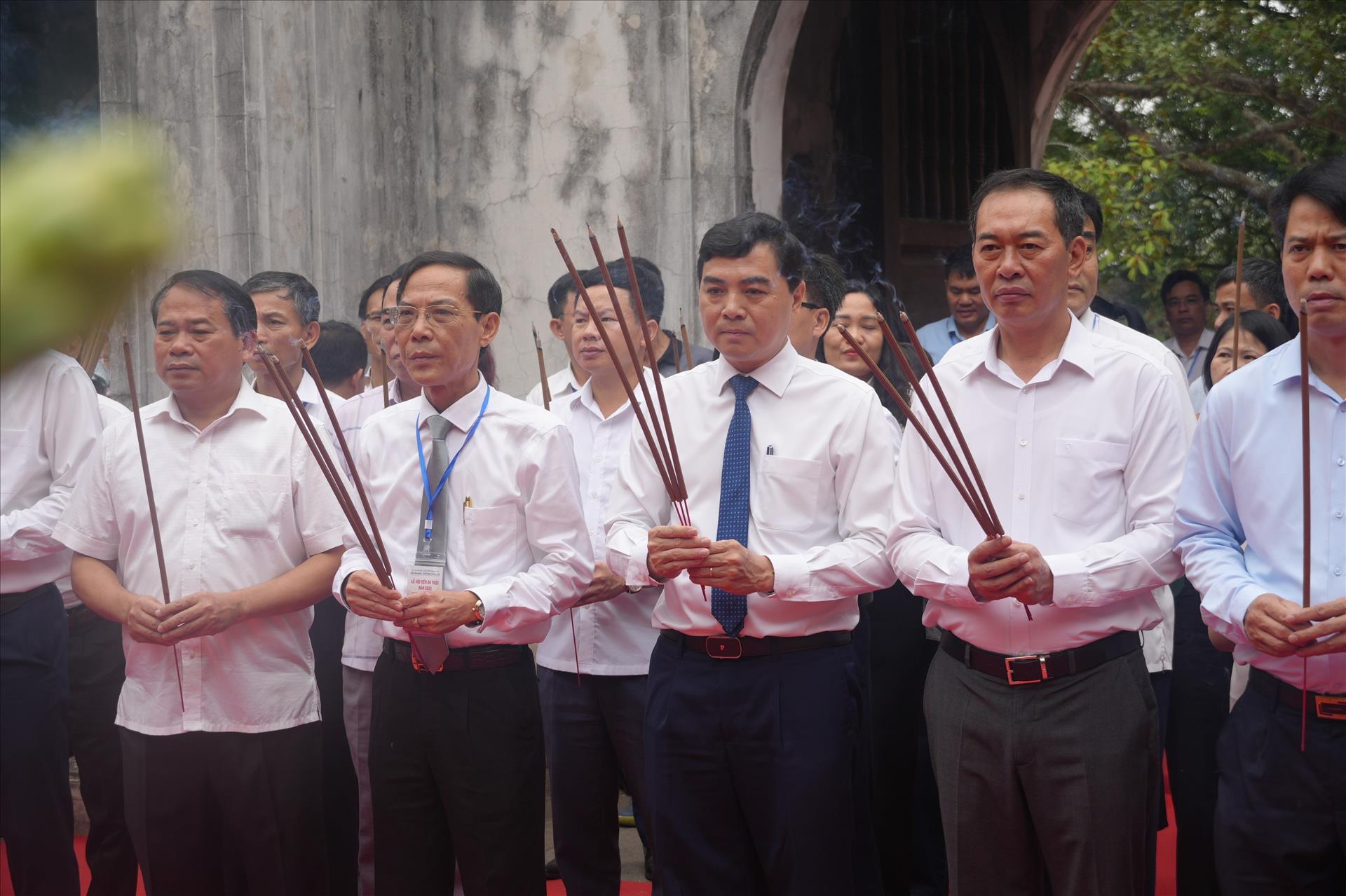 Ủy viên Trung ương Đảng, Phó Bí thư Tỉnh ủy, Chủ tịch UBND tỉnh Thanh Hóa Nguyễn Hoài Anh dâng hương kính cáo Anh hùng dân tộc Triệu Thị Trinh. Ảnh: Việt Hoàng - TTXVN