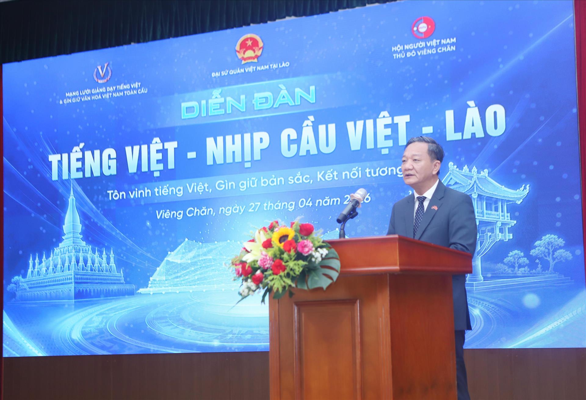Phát biểu khai mạc, Đại sứ Nguyễn Minh Tâm đánh giá cao việc tổ chức Diễn đàn với nội dung bài bản, phong phú, có chiều sâu, thể hiện sự phối hợp chặt chẽ giữa các cơ quan, tổ chức và cộng đồng; nhấn mạnh diễn đàn không chỉ là hoạt động hưởng ứng mang ý nghĩa văn hóa, mà còn là không gian kết nối, chia sẻ kinh nghiệm, góp phần thúc đẩy phong trào dạy và học tiếng Việt ngày càng thiết thực, hiệu quả tại Lào.