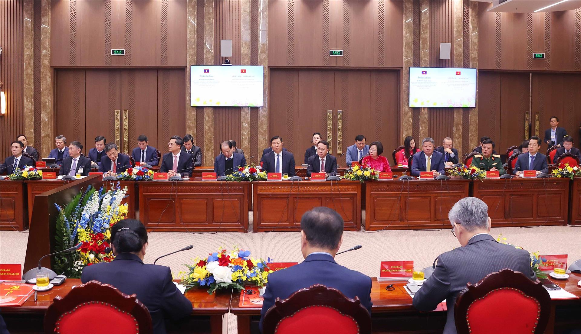 Đại biểu hai nước Việt nam và Lào tham dự buổi làm việc với Đảng bộ, Chính quyền TP. Hà Nội của Tổng Bí thư, Chủ tịch nước Lào Thongluon Sinsoulith. Ảnh: Văn Điệp – TTXVN