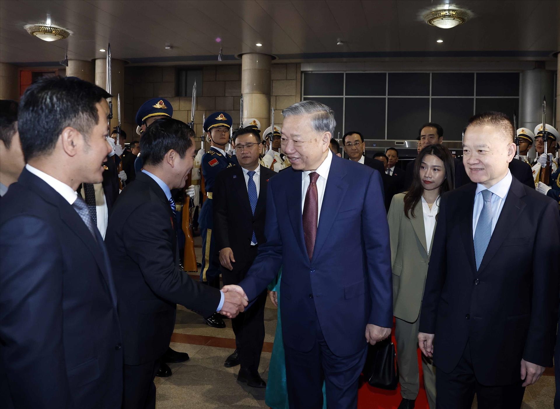 Tại nhà ga, tiễn Tổng Bí thư, Chủ tịch nước Tô Lâm và Phu nhân cùng đoàn đại biểu cấp cao Việt Nam có đồng chí Ân Dũng, Ủy viên Trung ương Đảng, Thị trưởng Bắc Kinh và đông đảo các cán bộ, nhân viên Đại sứ quán Việt Nam tại Trung Quốc.