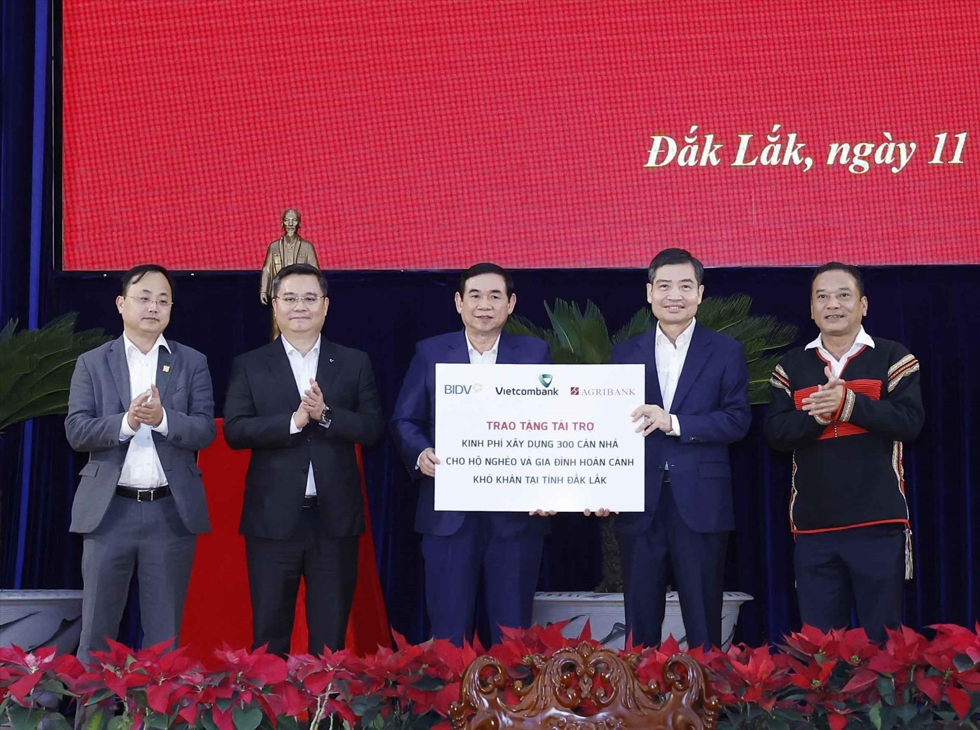 Đại diện Ngân hàng Thương mại Cổ phần Đầu tư và Phát triển Việt Nam (BIDV), Ngân hàng Thương mại Cổ phần Ngoại thương Việt Nam (Vietcombank), Ngân hàng Nông nghiệp và Phát triển nông thôn Việt Nam (Agibank) trao kinh phí xây dựng 300 căn nhà cho hộ gia đình nghèo và gia đình có hoàn cảnh khó khăn tại tỉnh Đắk Lắk.