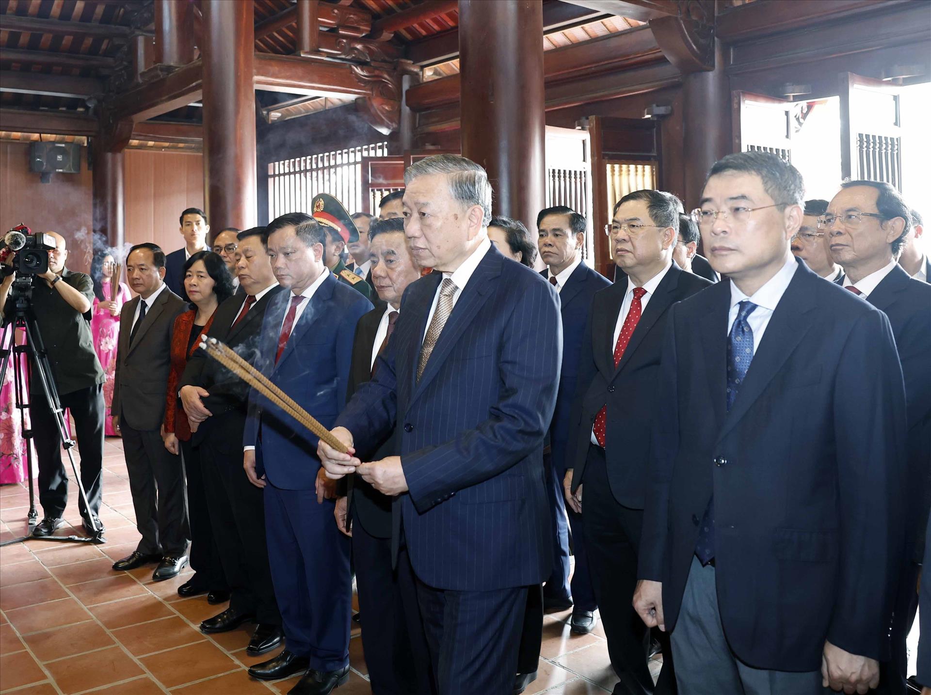 Tổng Bí thư Tô Lâm và thành viên Đoàn công tác dâng hương tưởng niệm Chủ tịch Hồ Chí Minh tại Khu Di tích quốc gia đặc biệt Kim Liên. Ảnh: Thống Nhất - TTXVN