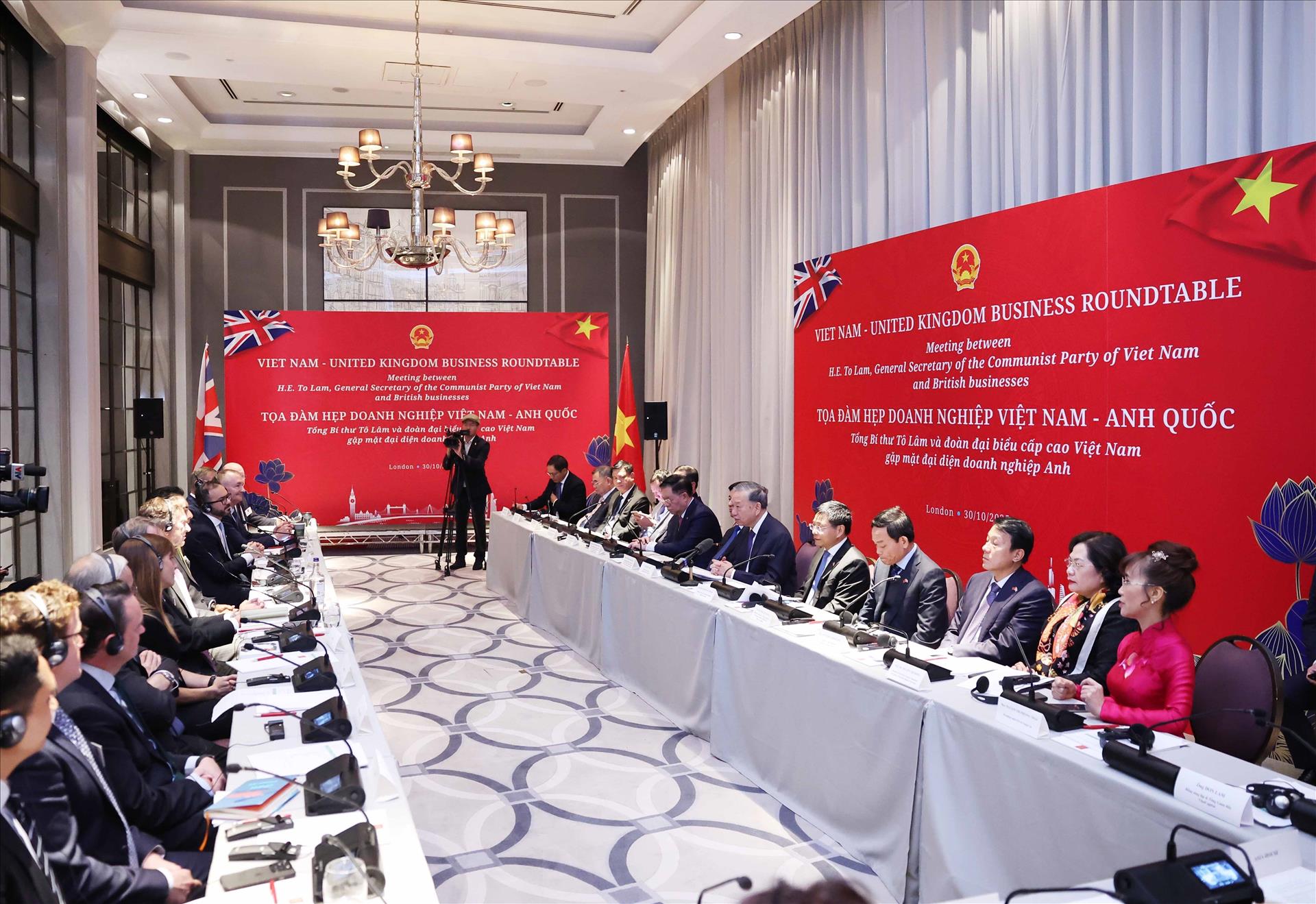 Theo đặc phái viên TTXVN, trong khuôn khổ chuyến thăm chính thức Liên hiệp Vương quốc Anh và Bắc Ireland, sáng 30/10 theo giờ địa phương, tại thủ đô London, Bộ Tài chính Việt Nam phối hợp với Đại sứ quán Việt Nam tại Liên hiệp Vương quốc Anh và Bắc Ireland tổ chức Tọa đàm Doanh nghiệp Việt Nam – Anh. Tổng Bí thư Tô Lâm và Đoàn đại biểu cấp cao Việt Nam dự Tọa đàm, cùng với sự tham dự của đông đảo các doanh nghiệp tiêu biểu hai nước.