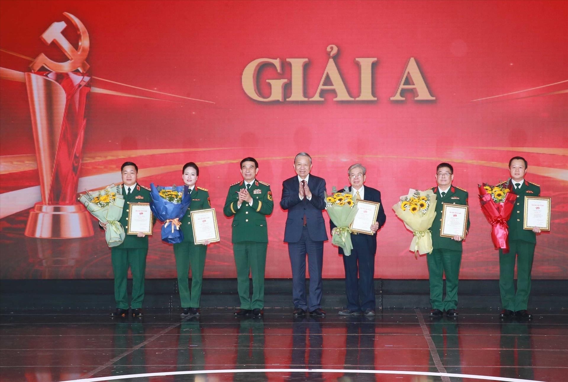 Tổng Bí thư Tô Lâm và Đại tướng, Bộ trưởng Quốc phòng Phan Văn Giang trao giải A cho các tác giả đoạt giải. Ảnh: Trọng Đức - TTXVN