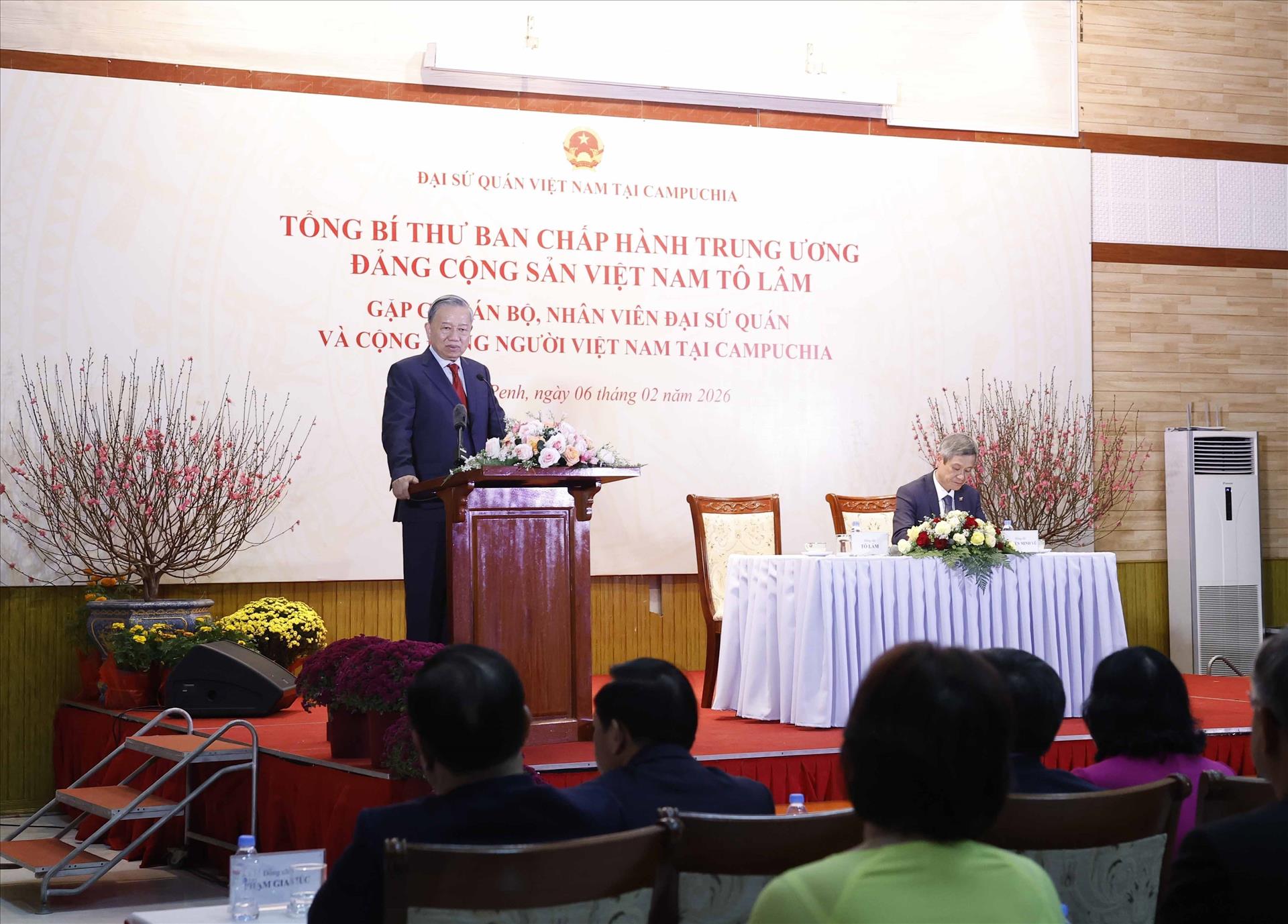 Theo phóng viên TTXVN tại Phnom Penh, trong chuyến thăm cấp Nhà nước tới Vương quốc Campuchia, chiều 6/2, tại thủ đô Phnom Penh, Tổng Bí thư Tô Lâm đã có cuộc gặp gỡ cán bộ, nhân viên Đại sứ quán Việt Nam tại Campuchia và cộng đồng người Việt Nam đang sinh sống, làm việc và học tập tại đất nước Chùa Tháp. Cùng dự có Thủ tướng Chính phủ Phạm Minh Chính, Chủ tịch Quốc hội Trần Thanh Mẫn, cùng các thành viên đoàn đại biểu cấp cao Việt Nam; đại diện Hội Khmer-Việt Nam tại Campuchia (KVA), Hiệp hội Doanh nghiệp Việt Nam-Campuchia (VCBA), cùng đông đảo trí thức, lưu học sinh và kiều bào tại Campuchia.