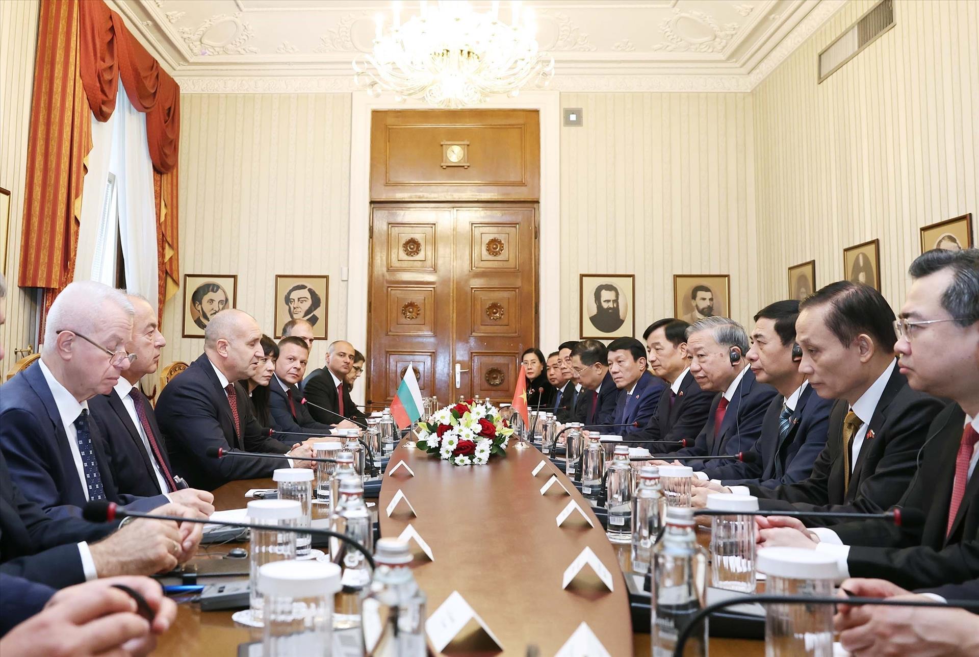 Tổng Bí thư Tô Lâm cảm ơn Tổng thống Rumen Radev về sự đón tiếp trọng thị, nồng hậu, thắm tình hữu nghị dành cho Đoàn đại biểu cấp cao Việt Nam và nhấn mạnh Việt Nam đặc biệt coi trọng quan hệ với Bulgaria, luôn ghi nhớ, trân trọng sự ủng hộ quý báu của nhân dân Bulgaria dành cho Việt Nam trong công cuộc đấu tranh giải phóng dân tộc, giành độc lập, thống nhất đất nước, cũng như trong xây dựng và phát triển đất nước.