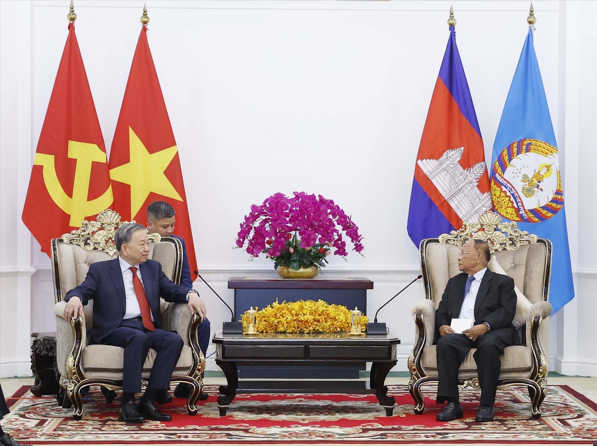 Tổng Bí thư nhấn mạnh chuyến thăm lần này rất ý nghĩa, Việt Nam vừa tổ chức thành công Đại hội lần thứ XIV của Đảng Cộng sản Việt Nam, đề ra tầm nhìn chiến lược mới. Bày tỏ vui mừng được gặp lại Tổng Bí thư Tô Lâm, Chủ tịch danh dự CPP Heng Samrin nhấn mạnh chuyến thăm và cơ chế các Cuộc gặp mang lại những kết quả tốt đẹp cho mỗi nước và quan hệ hai nước, đồng thời thể hiện sinh động chính sách nhất quán của Đảng và Nhà nước Việt Nam coi trọng và ưu tiên cao cho việc phát triển quan hệ hữu nghị truyền thống với Campuchia.