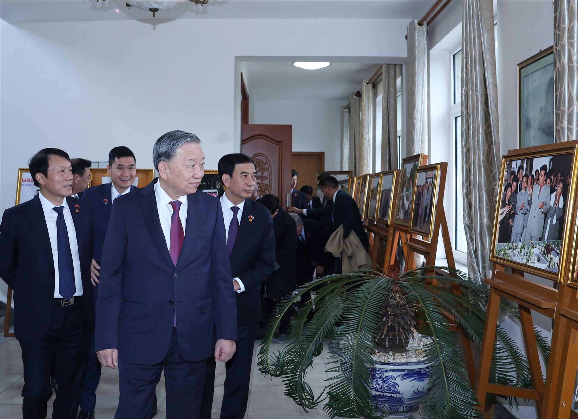 Tổng Bí thư Tô Lâm xem một số hình ảnh trưng bày về quan hệ Việt Nam -Triều Tiên tại Đại sứ quán tại Triều Tiên. Ảnh: Thống Nhất – TTXVN