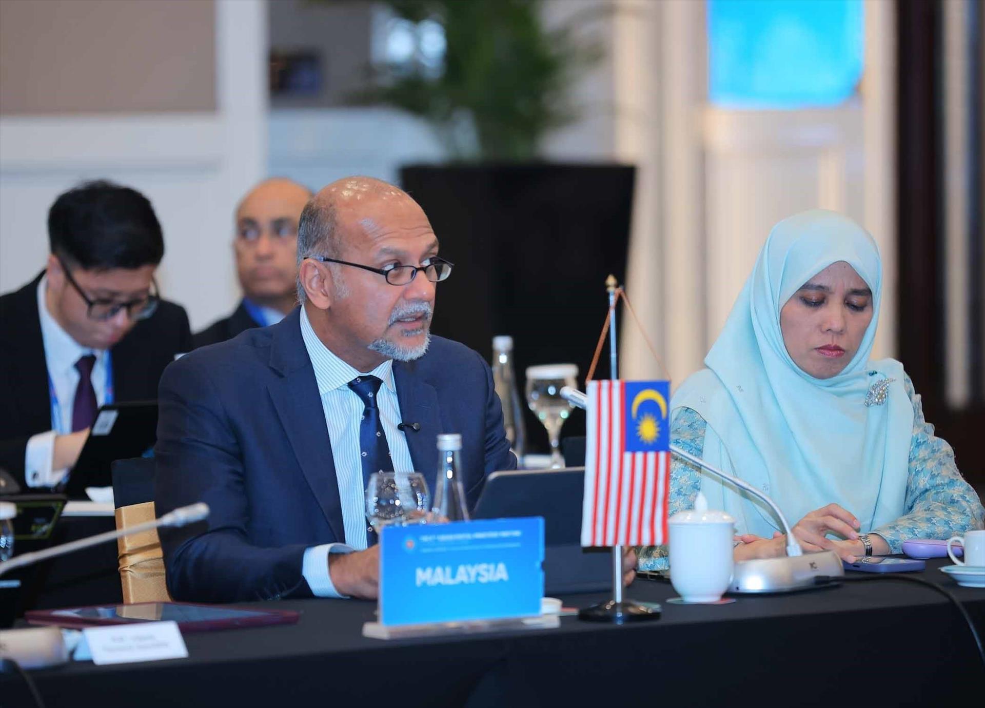 Bộ trưởng Bộ Kỹ thuật số Malaysia Gobind Sign Deo tham luận tại hội nghị. Ảnh: Hoàng Hiếu - TTXVN