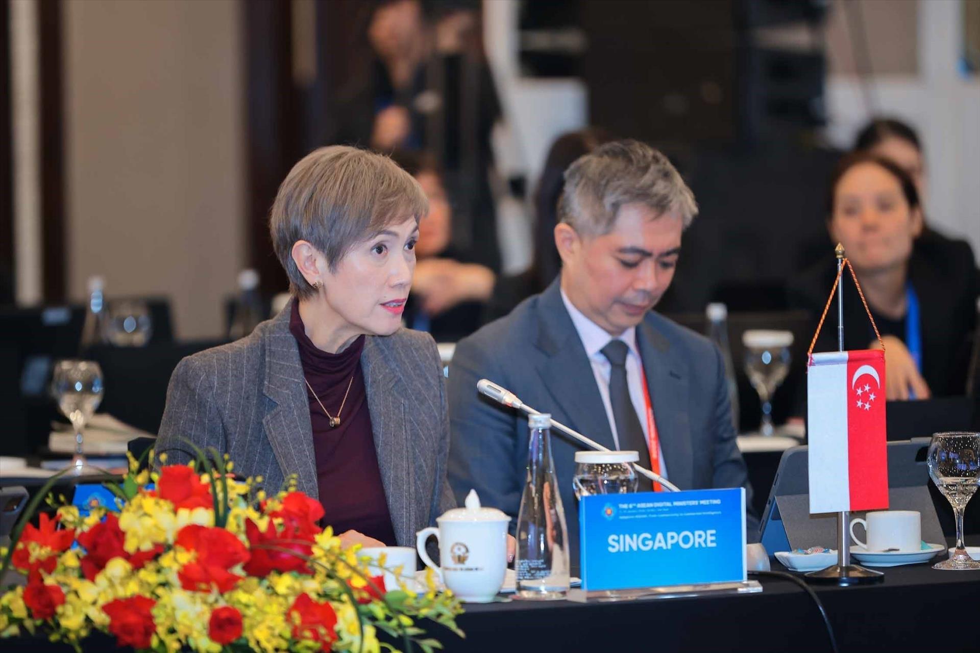 Bộ trưởng Bộ Phát triển Kỹ thuật số và Thông tin Singapore; Bộ trưởng phụ trách An ninh mạng và Chương trình Quốc gia Thông minh (Smart Nation) Josephine Teo tham luận tại hội nghị. Ảnh: Hoàng Hiếu - TTXVN