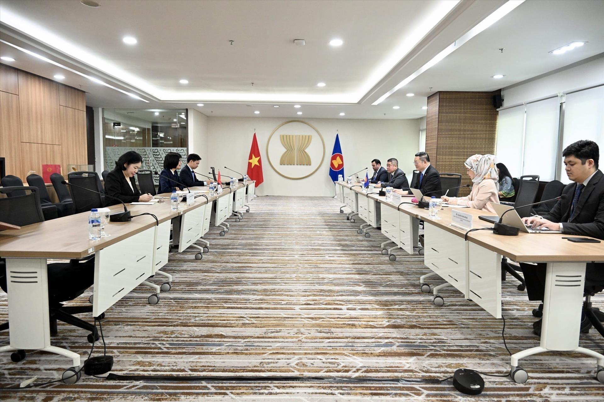 Đại sứ trao đổi với Tổng Thư ký phương hướng thúc đẩy hợp tác cụ thể, thực chất trong ASEAN và với các đối tác về đổi mới mô hình tăng trưởng dựa vào khoa học, công nghệ, đổi mới sáng tạo, phát triển bền vững, chuyển đổi xanh, đảm bảo an ninh năng lượng, an ninh lượng thực và phát triển hạ tầng khu vực.
