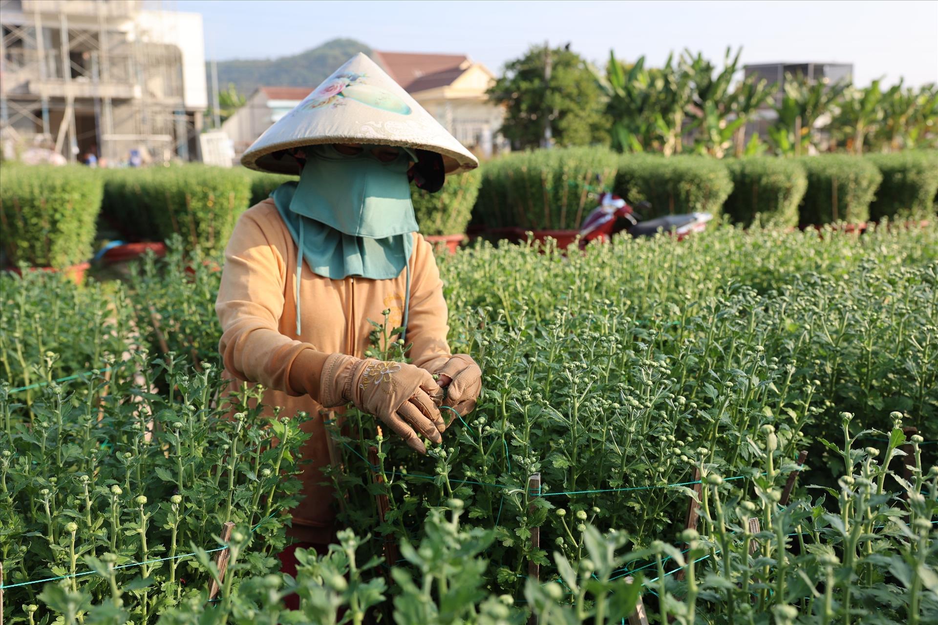 Những ngày này, dọc các tuyến đường dẫn vào làng hoa, dễ dàng bắt gặp hình ảnh nông dân miệt mài lặt nụ, cột dây, chỉnh tán, tưới nước cho từng chậu hoa. Được xuống giống từ đầu tháng 8 âm lịch, đến nay các chậu hoa đã phát triển thân lá xanh tốt, nhiều nụ, sinh trưởng đồng đều. Mặc dù thời tiết cuối năm có những biến động nhất định, song nhờ áp dụng đúng quy trình kỹ thuật và chủ động theo dõi diễn biến thời tiết, nhiều nhà vườn trên địa bàn TP. Hồ Chí Minh vẫn kiểm soát tốt quá trình sinh trưởng của cây. Đáng mừng là hoa không bị nở sớm như ở một số địa phương khác, giúp người trồng yên tâm hơn trong việc canh thời điểm xuất bán.