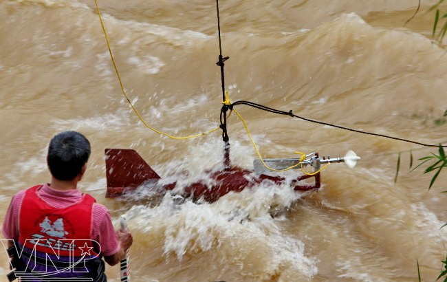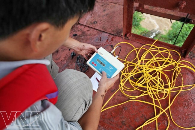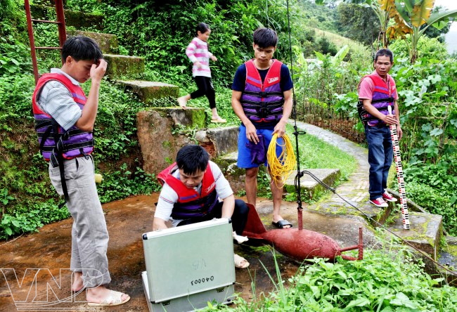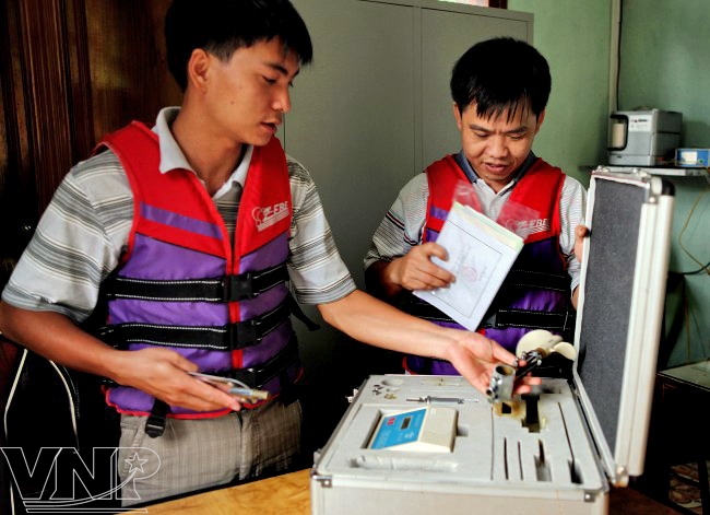 Các cán bộ thủy văn chuẩn bị thiết bị đo đạc số liệu.