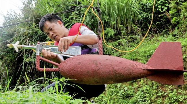 Anh Tuấn Anh đang kiểm tra mực nước dưới dòng Nậm Kim.