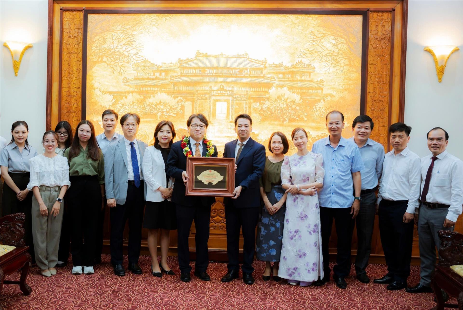 Phó Chủ tịch UBND thành phố Huế Trần Hữu Thùy Giang, trao tặng Danh hiệu “Công dân Danh dự thành phố Huế" cho ông Kang Bong Jun. Ảnh: Nguyên Lý - TTXVN