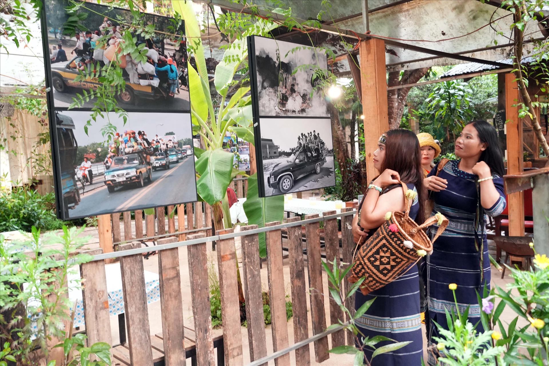 Các nghệ sĩ người dân tộc K'Ho tranh thủ xem ảnh triển lãm trước giờ khai mạc. Ảnh Chu Quốc Hùng - TTXVN