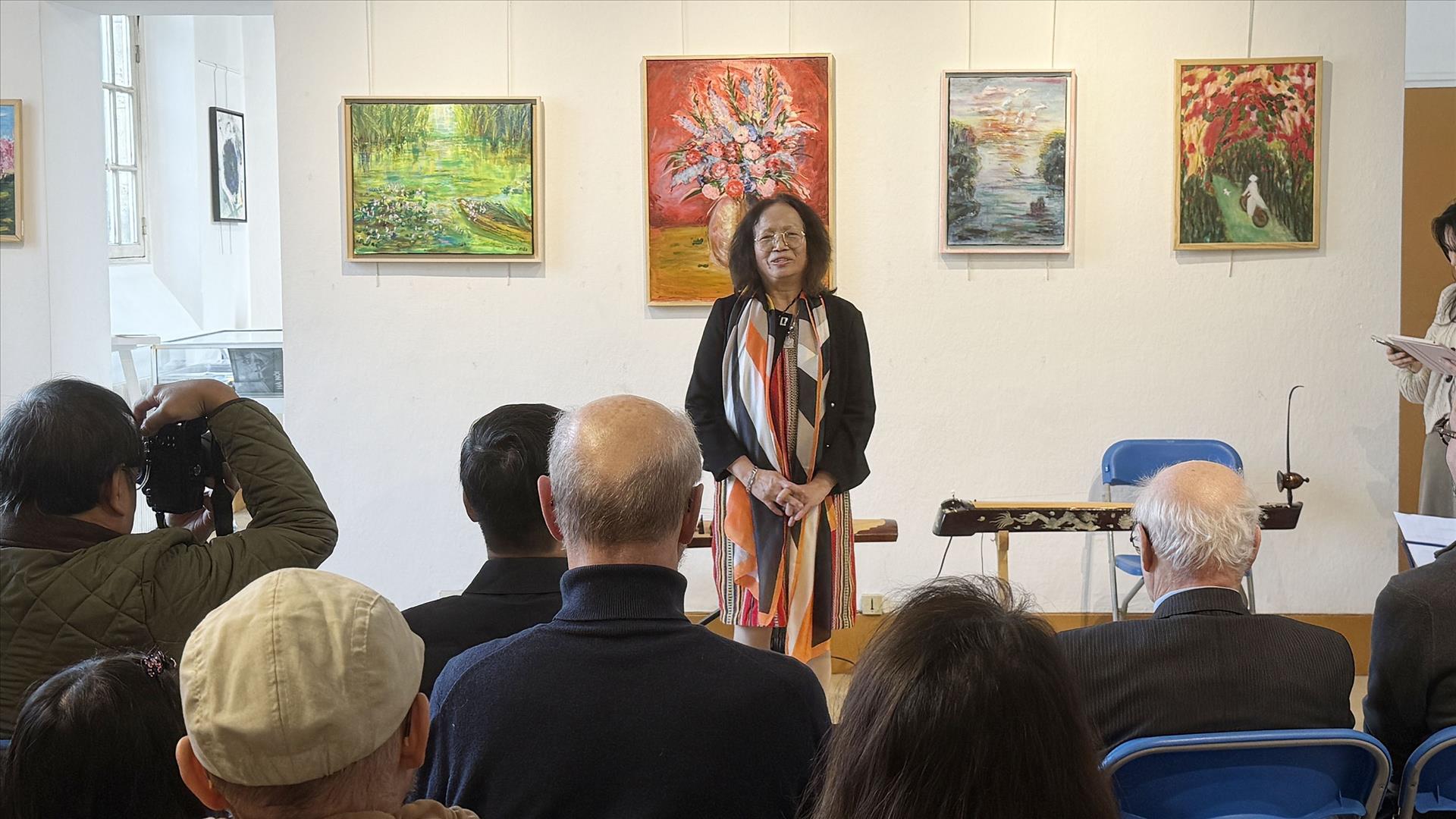 Bà Trần Thu Dung, Chủ tịch Câu lạc bộ Yêu biển đảo Việt Nam tại Pháp, phát biểu khai mạc triển lãm. Ảnh: Hữu Chiến - P/v TTXVN tại Pháp