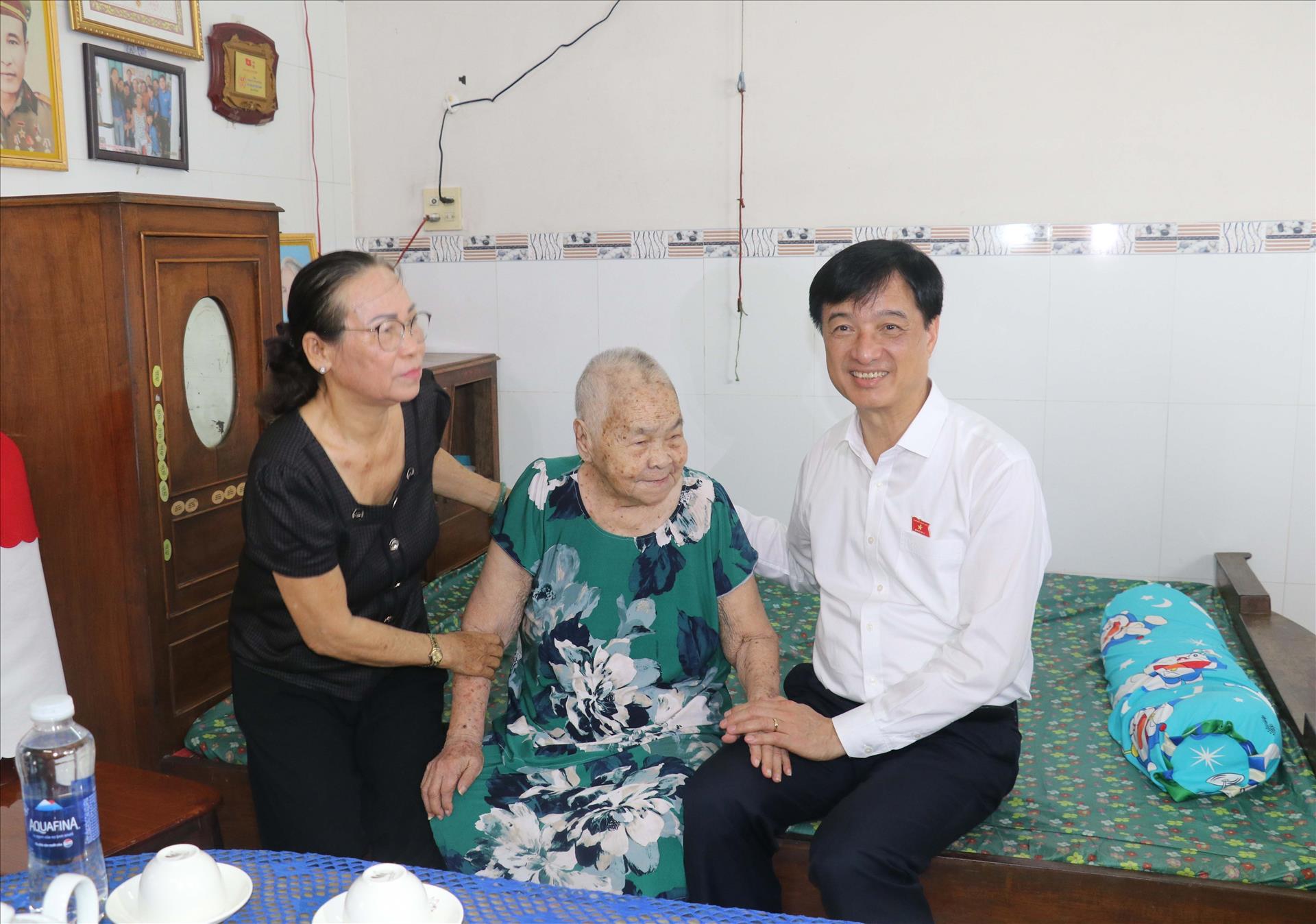 Đồng chí Nguyễn Duy Ngọc thăm, tặng quà gia đình Mẹ VNAH Huỳnh Thị Lành, 94 tuổi đời, 58 năm tuổi Đảng, có chồng là Anh hùng LLVTND Nguyễn Hữu Cầu, có 2 con là Liệt sĩ; ngụ tại phường An Bình. Ảnh: Ngọc Thiện - TTXVN