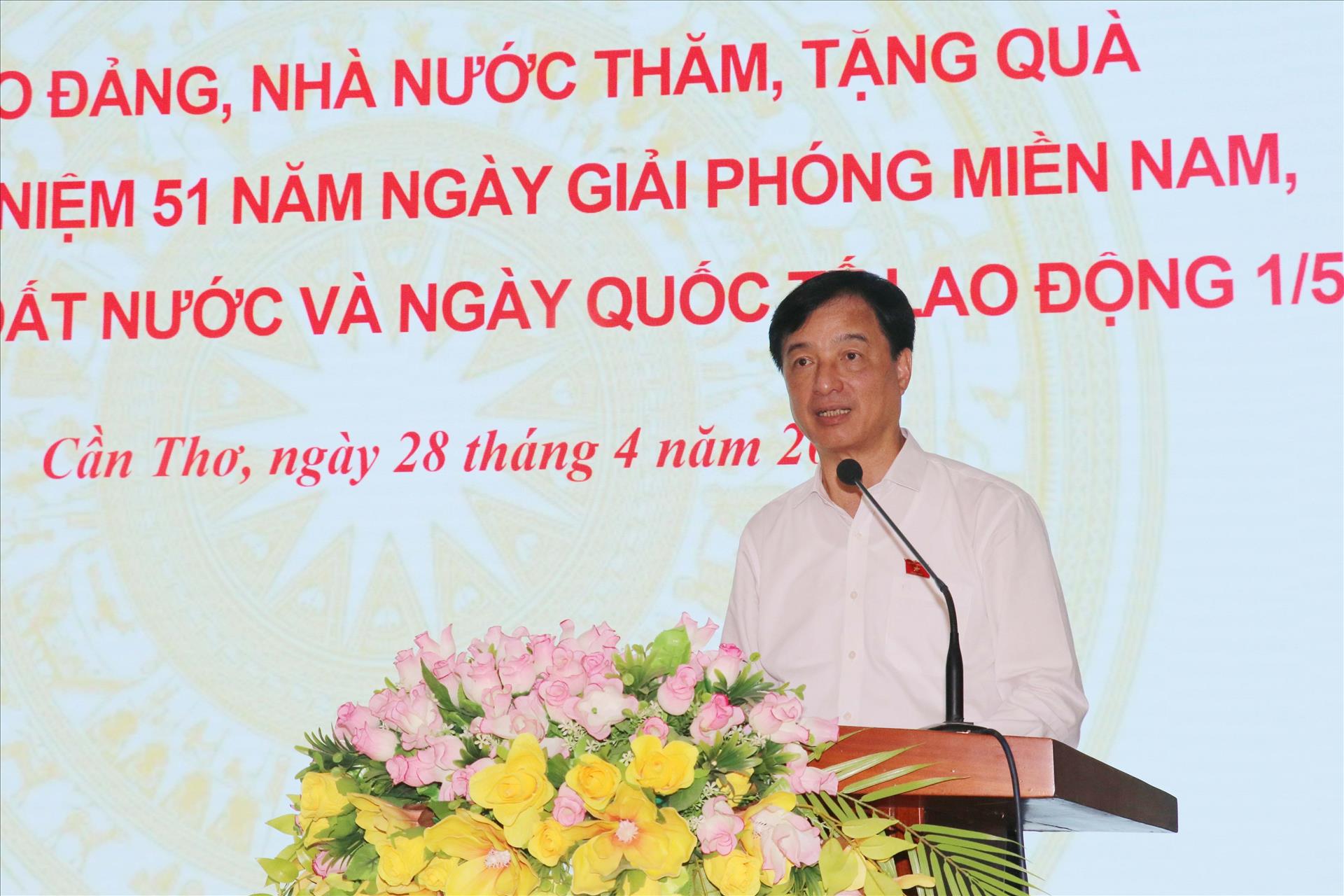 Đồng chí Nguyễn Duy Ngọc phát biểu tại buổi đến thăm, tặng quà cho các gia đình chính sách, hộ nghèo và người lao động TP. Cần Thơ. Ảnh: Ngọc Thiện - TTXVN