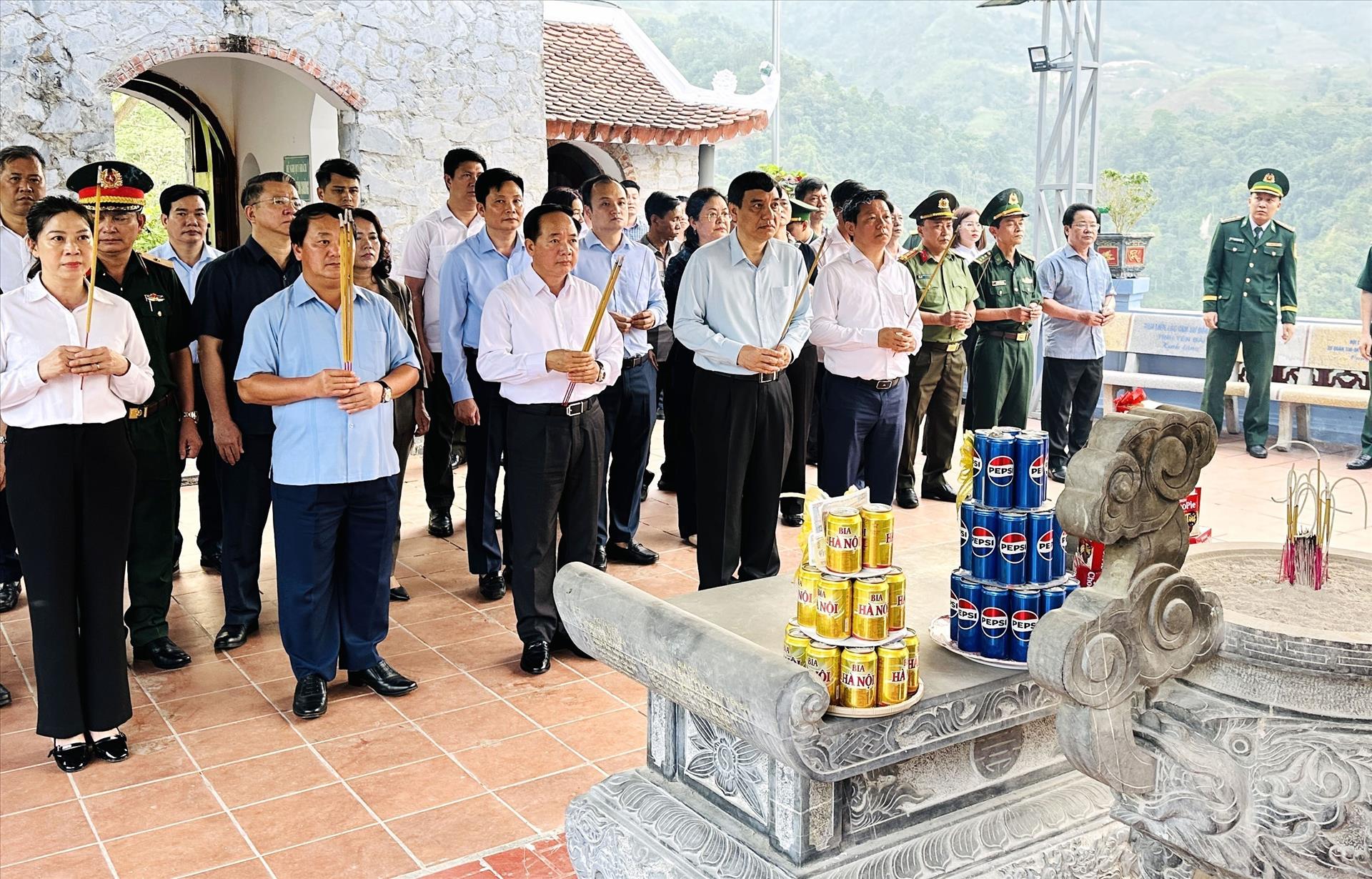 Đồng chí Trịnh Văn Quyết, Ủy viên Bộ Chính trị, Bí thư Trung ương Đảng, Trưởng Ban Tuyên giáo và Dân vận Trung ương cùng đoàn công tác dâng hương, viếng các Anh hùng liệt sĩ tại Đền thờ các Anh hùng Liệt sĩ mặt trận Vị Xuyên tại điểm cao 468, xã Thanh Thủy. Ảnh: Đức Thọ - TTXVN
