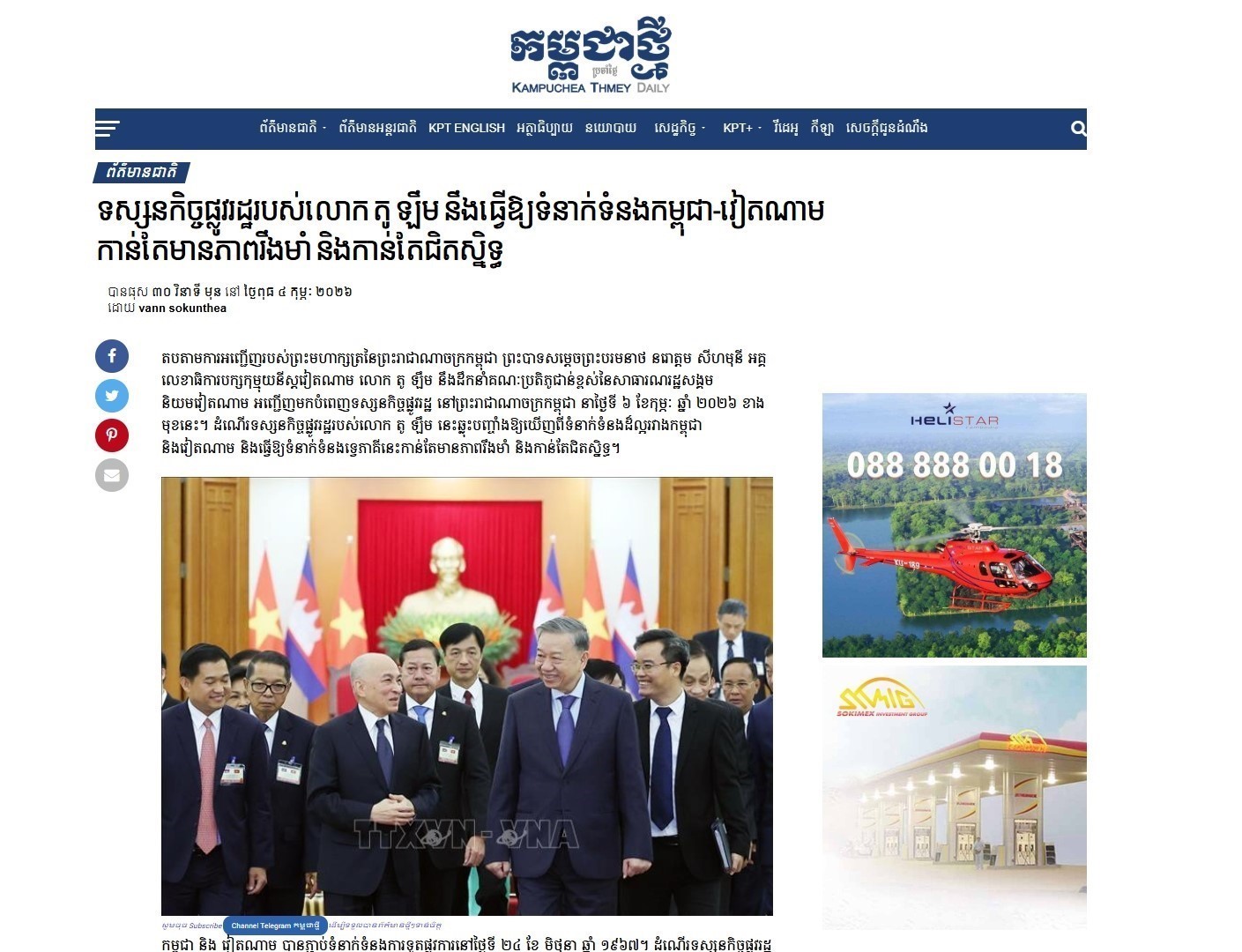 Trước thềm chuyến thăm cấp Nhà nước của Tổng Bí thư Tô Lâm tới Vương quốc Campuchia ngày 6/2, trong những ngày qua, nhiều cơ quan báo chí, truyền thông sở tại như Thông tấn xã Campuchia (AKP), “Koh Santepheap” (Đảo Hòa Bình), “Kampuchea Thmey Daily” (Nhật báo Campuchia Mới)… liên tục đăng phát nhiều bài viết đưa tin đậm nét về chuyến thăm sắp tới của Tổng Bí thư Tô Lâm và Đoàn đại biểu cấp cao Việt Nam.