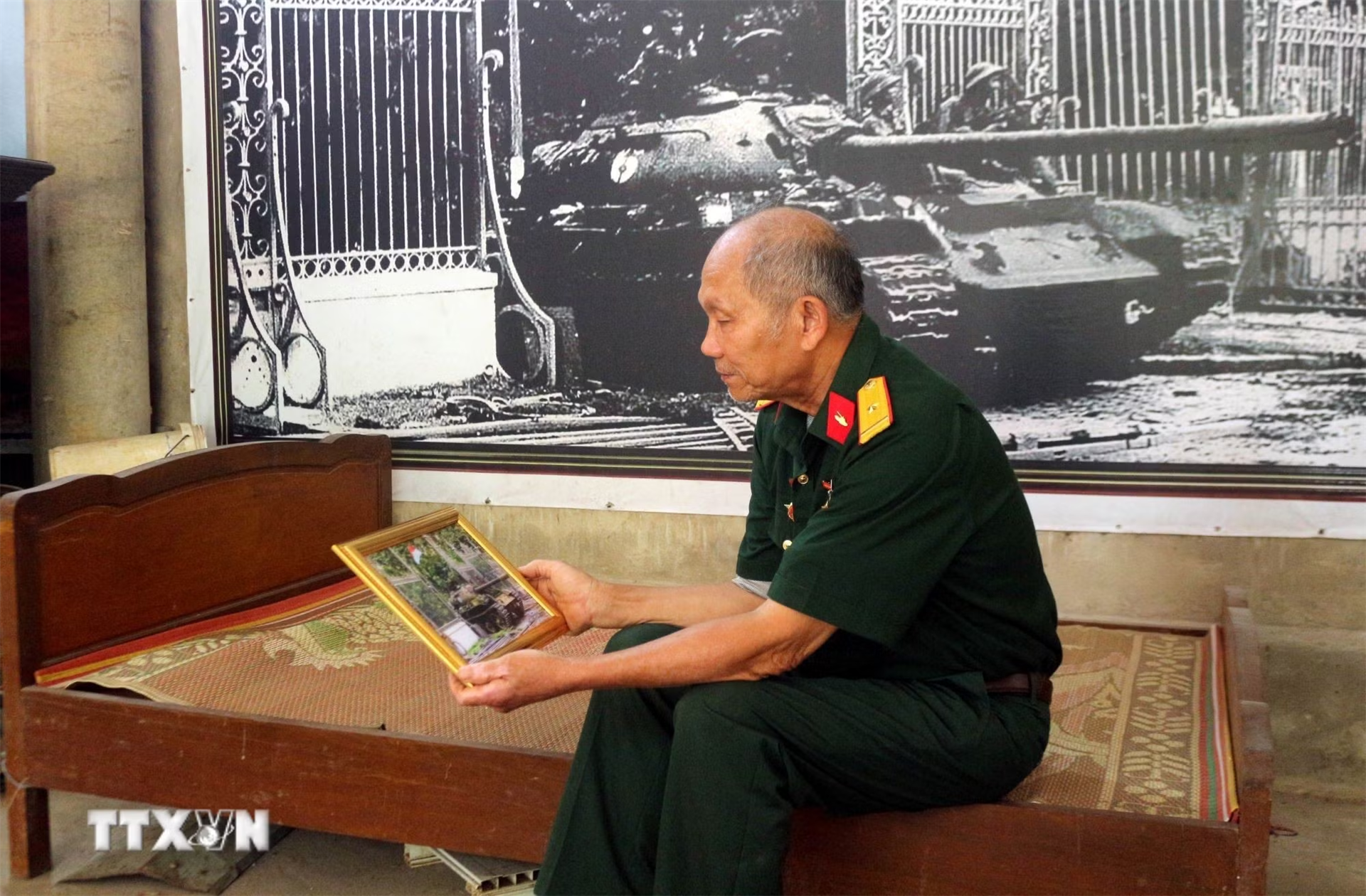 Cựu chiến binh Trần Bình Yên xem bức ảnh do nhà báo Trần Mai Hưởng, cựu phóng viên chiến trường, nguyên Tổng Giám đốc TTXVN chụp, ghi lại xe tăng T54B-846 do ông lái tiến vào Dinh Độc Lập trưa 30/4/1975. Ảnh: Nguyễn Chinh/TTXVN