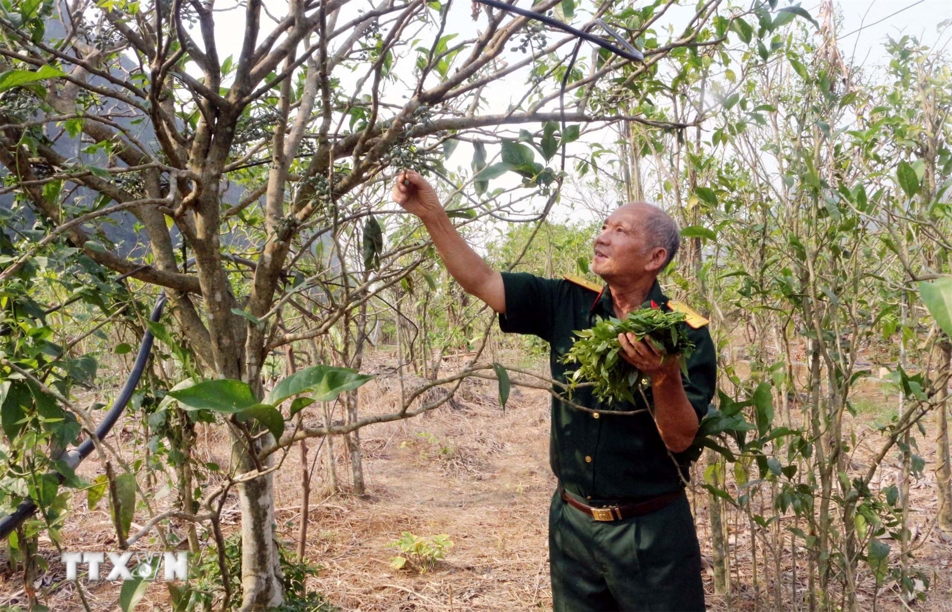 Cựu chiến binh Trần Bình Yên chăm sóc vườn đồi của gia đình. Ảnh: Nguyễn Chinh/