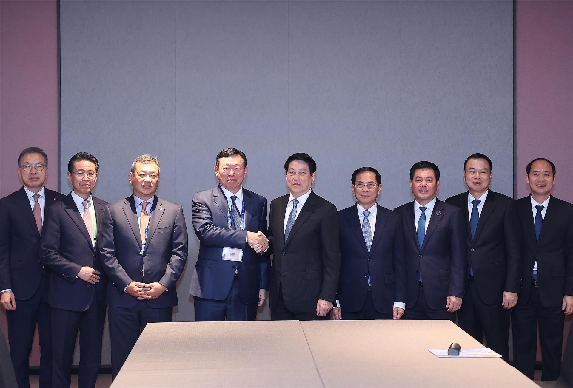 Chủ tịch nước Lương Cường với Chủ tịch Tập đoàn Lotte Shin Dong-bin và các đại biểu. Ảnh: Lâm Khánh – TTXVN