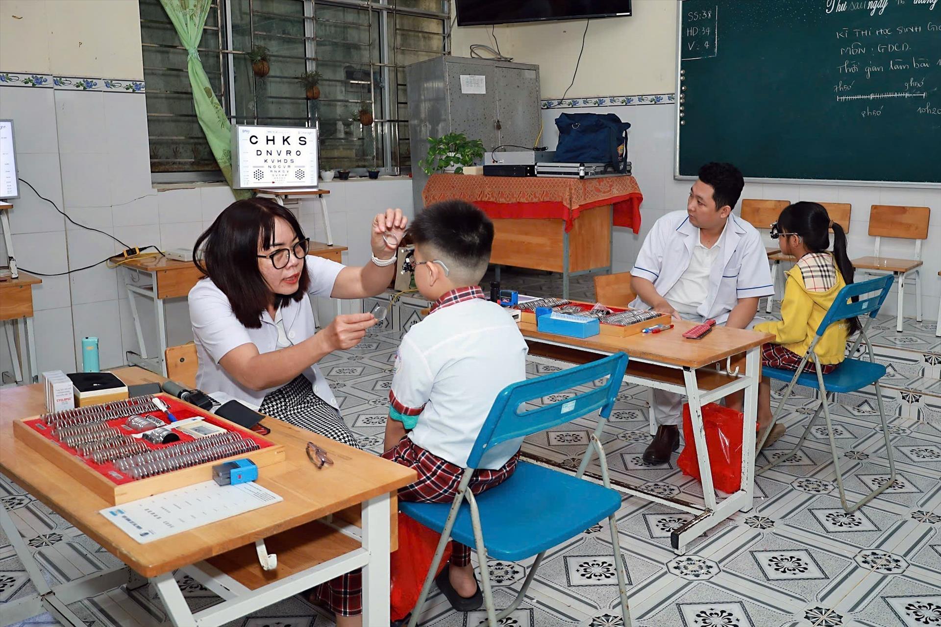 Hoạt động khám mắt cho thiếu nhi tại Chiến dịch “Xuân tình nguyện” ở xã Cù Lao Dung. Ảnh: TTXVN phát