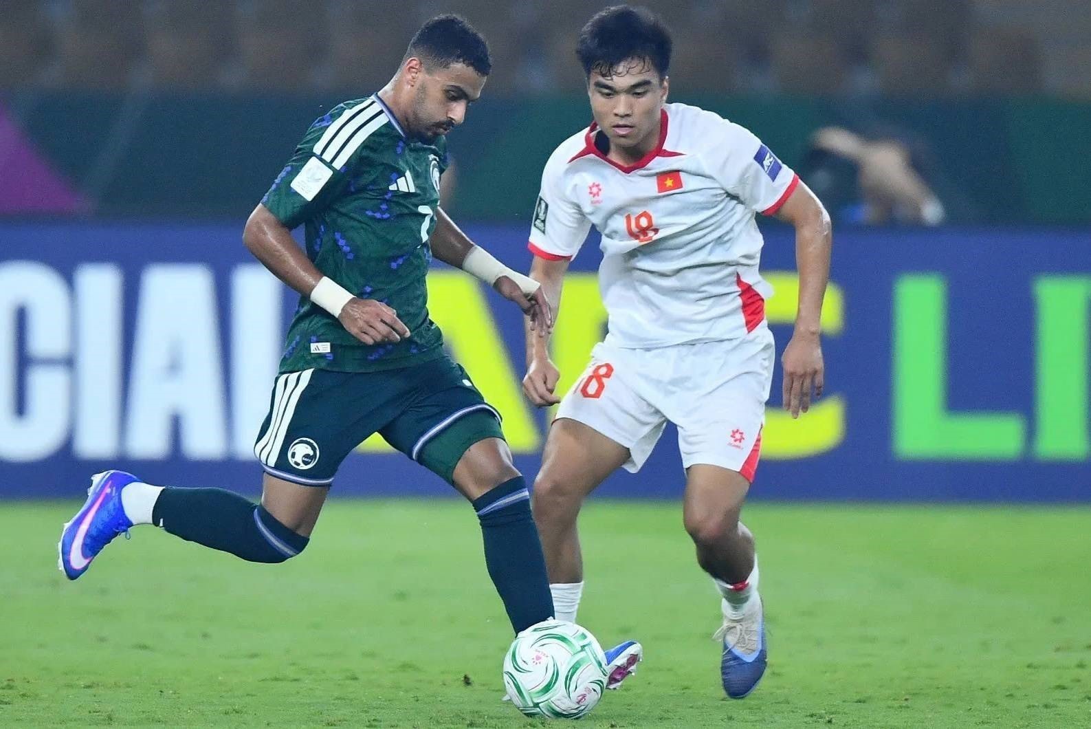 Khuất Văn Khang số 11- U23 Việt Nam tranh chấp bóng với cầu thủ Arab Saudi.Ảnh: Nguồn AFC/TTXVN phát