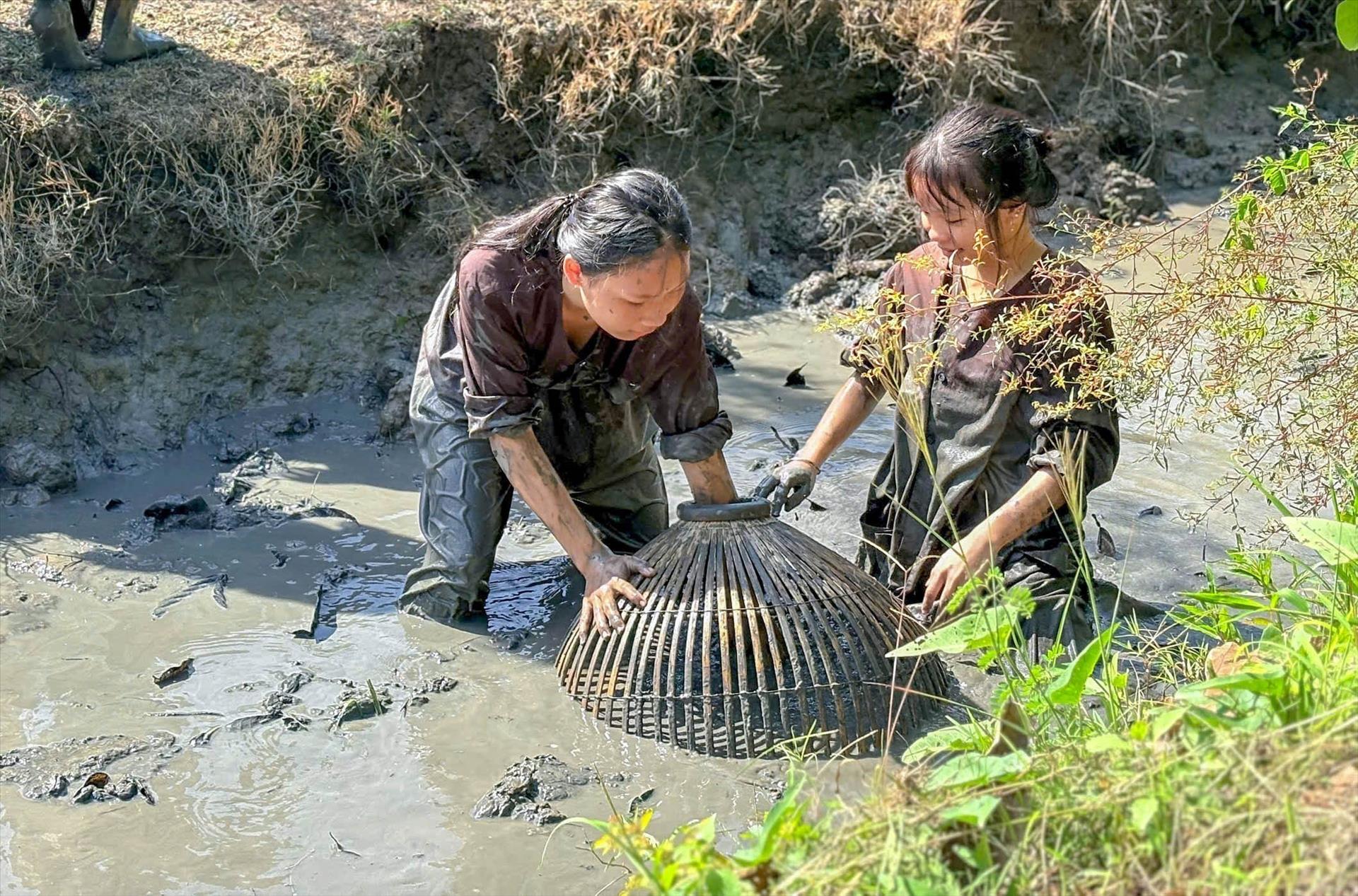 Trải nghiệm tát mương bắt cá ở Sông Hậu Farm. Ảnh: Thanh Liêm - TTXVN